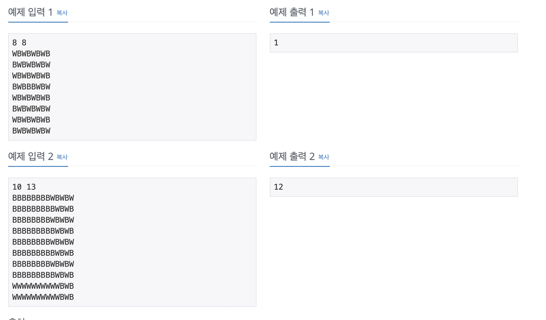 첫째 줄에 N과 M이 주어진다. N과 M은 8보다 크거나 같고, 50보다 작거나 같은 자연수이다. 둘째 줄부터 N개의 줄에는 보드의 각 행의 상태가 주어진다. B는 검은색이며, W는 흰색이다.