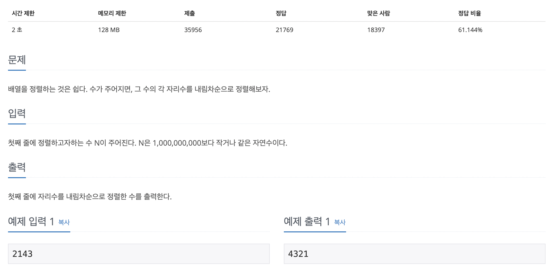 첫째 줄에 정렬하고자하는 수 N이 주어진다. N은 1,000,000,000보다 작거나 같은 자연수이다.