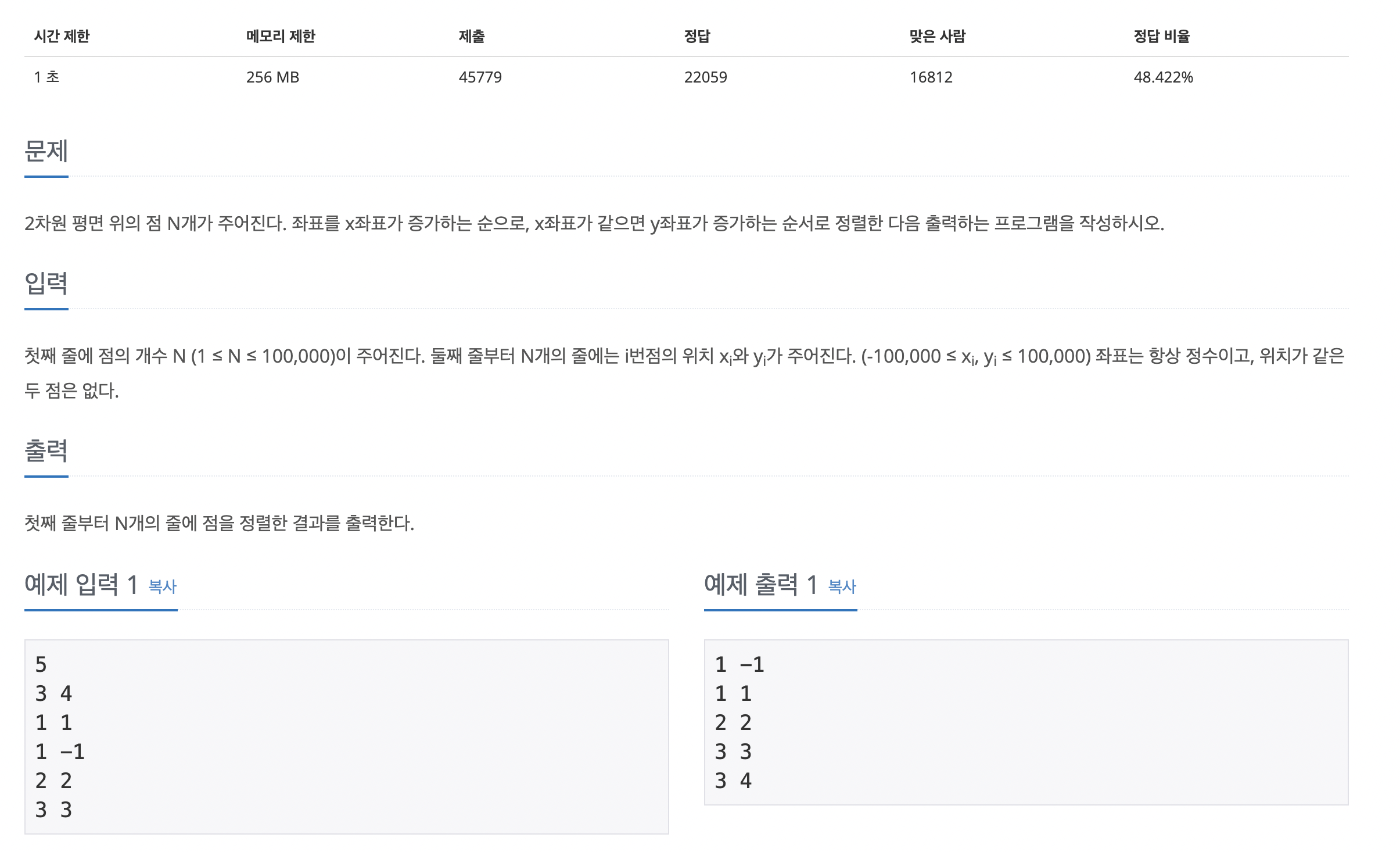 2. x좌표가 같을 시 y좌표를 비교해 y좌표가 더 작은 것을 먼저 출력한다.