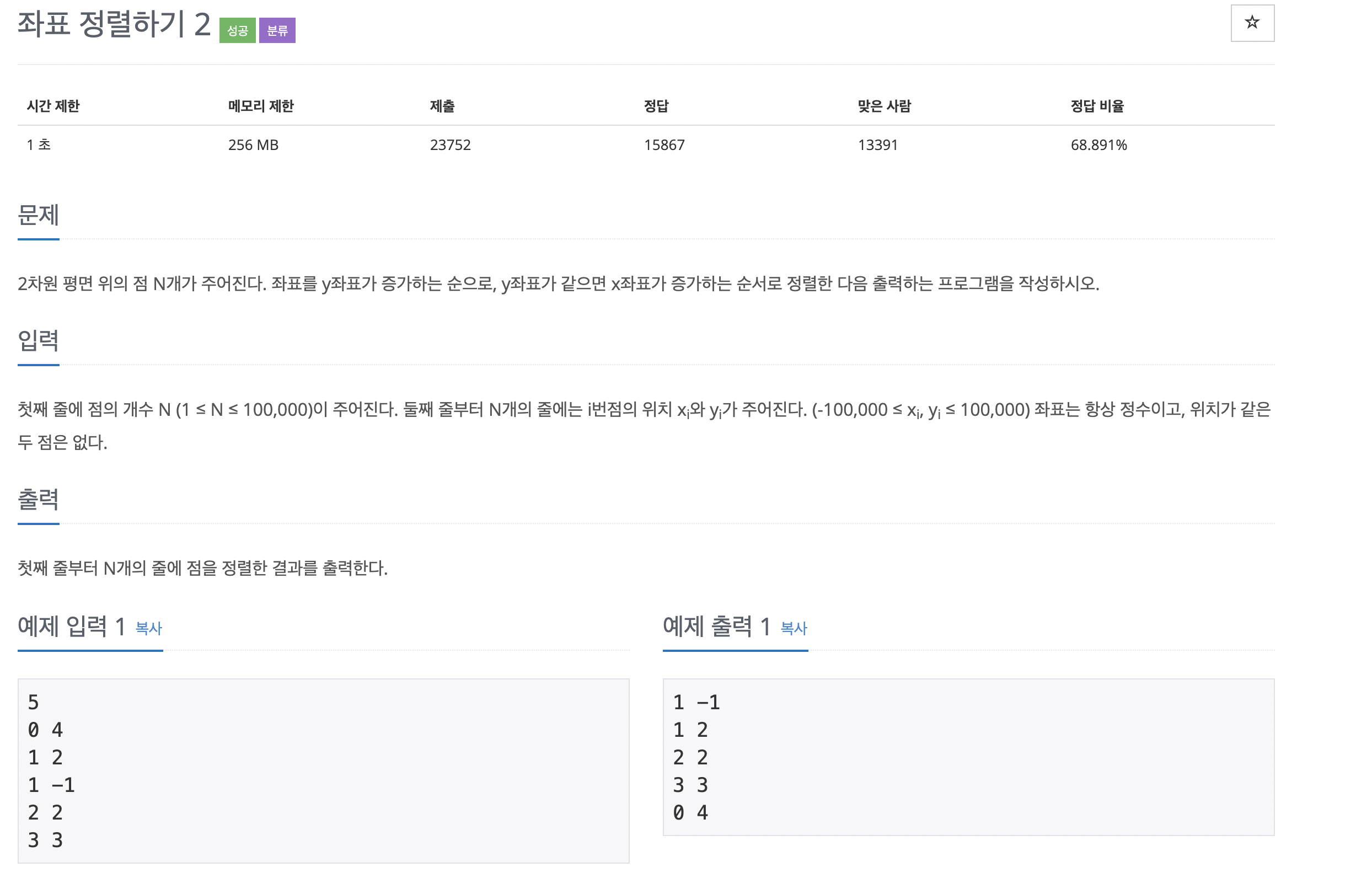 첫째 줄에 점의 개수 N (1 ≤ N ≤ 100,000)이 주어진다. 둘째 줄부터 N개의 줄에는 i번점의 위치 xi와 yi가 주어진다. (-100,000 ≤ xi, yi ≤ 100,000) 좌표는 항상 정수이고, 위치가 같은 두 점은 없다.
