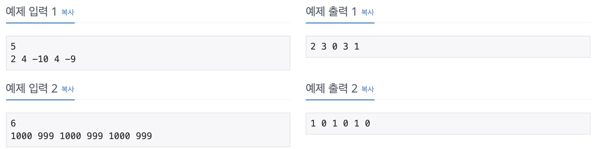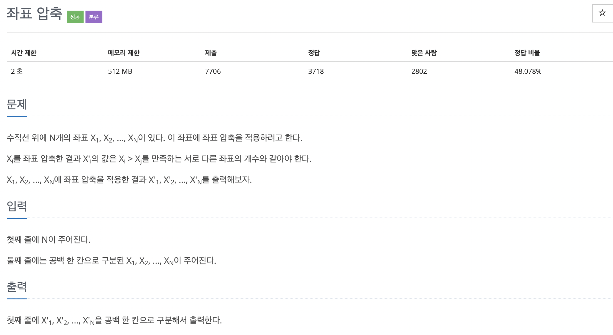 수직선 위에 N개의 좌표 X1, X2, ..., XN이 있다. 이 좌표에 좌표 압축을 적용하려고 한다. Xi를 좌표 압축한 결과 X'i의 값은 Xi > Xj를 만족하는 서로 다른 좌표의 개수와 같아야 한다. X1, X2, ..., XN에 좌