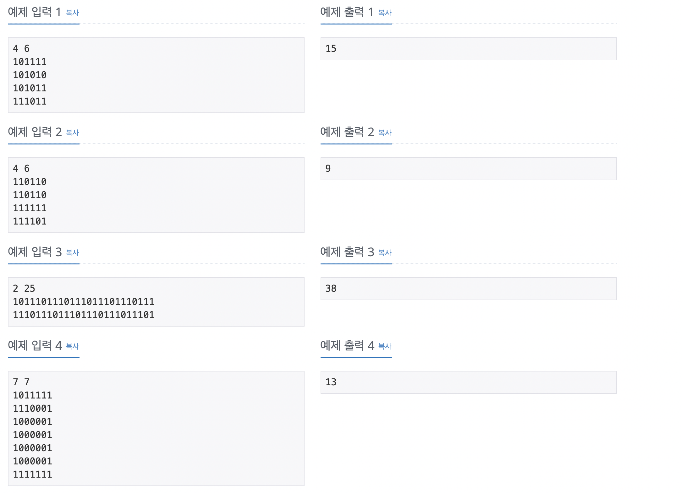 첫째 줄에 두 정수 N, M(2 ≤ N, M ≤ 100)이 주어진다. 다음 N개의 줄에는 M개의 정수로 미로가 주어진다. 각각의 수들은 붙어서 입력으로 주어진다.