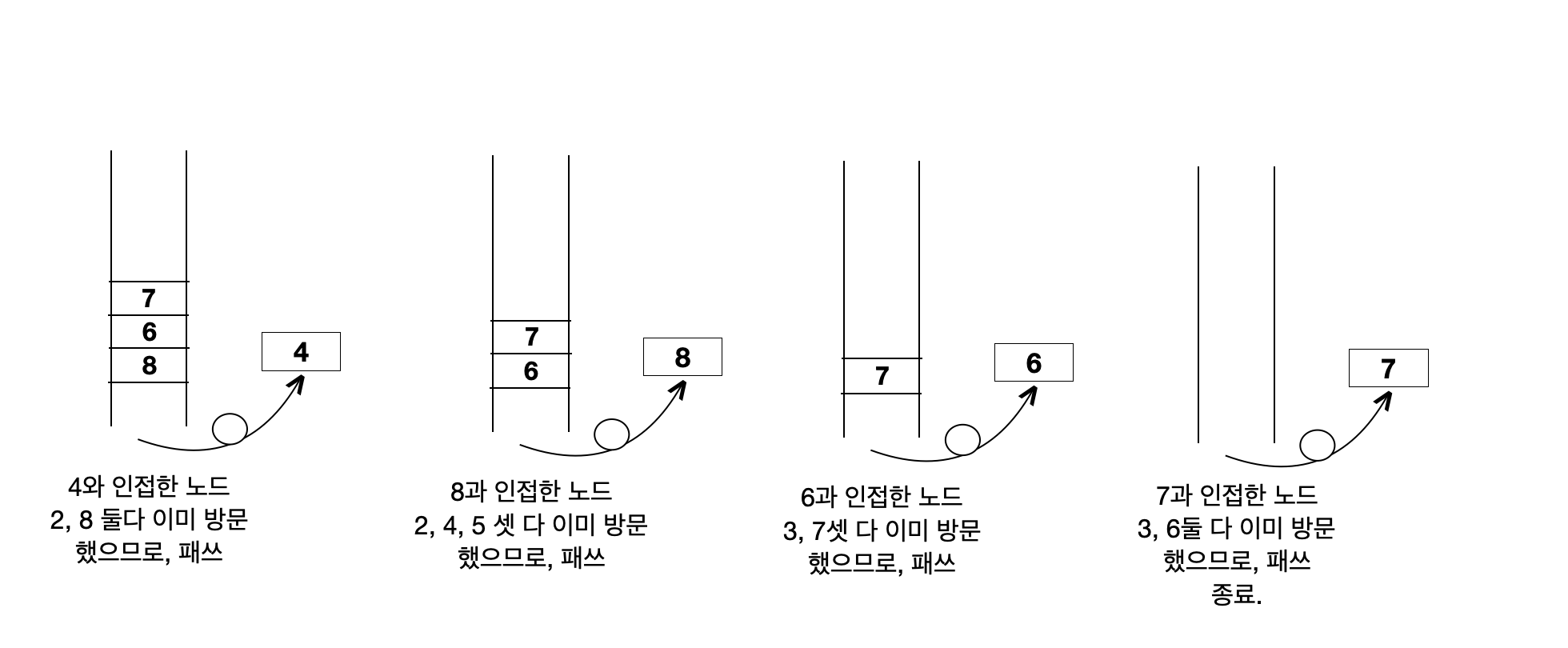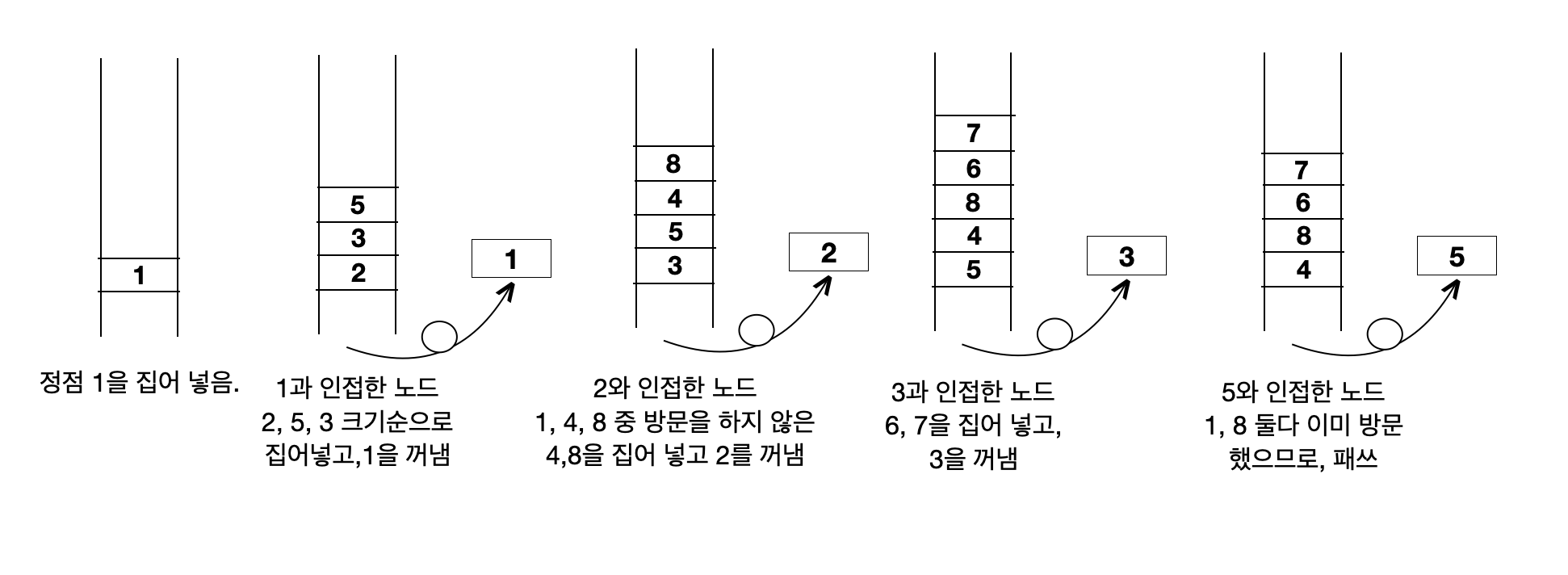 집어 넣은 순서대로 1 -> 2 -> 3 -> 5 -> 4 -> 8 -> 6 -> 7