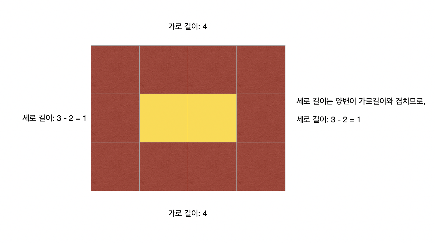2. (가로*2)+(세로-2)*2 = 테두리 넓이, 즉 brown 이다.