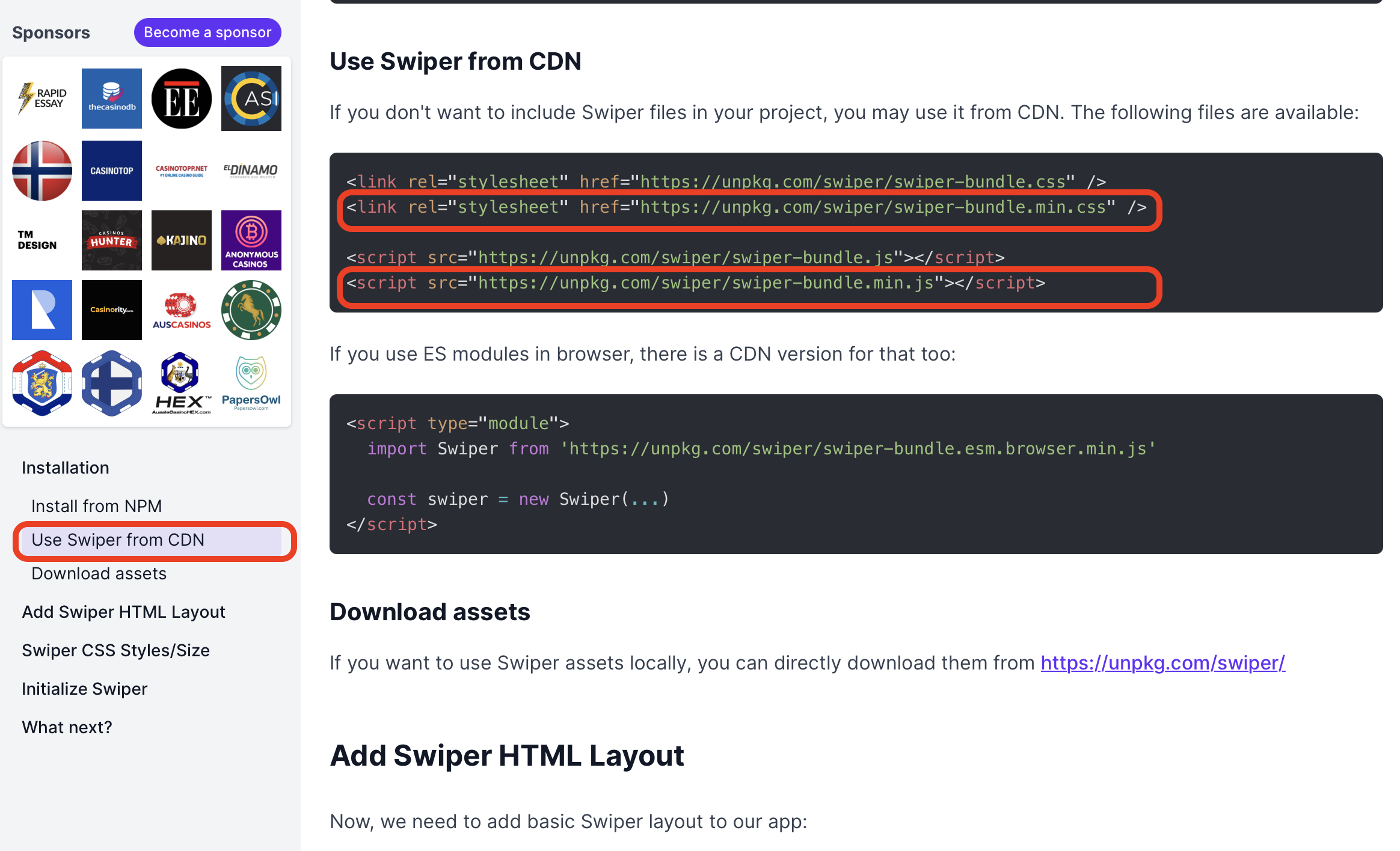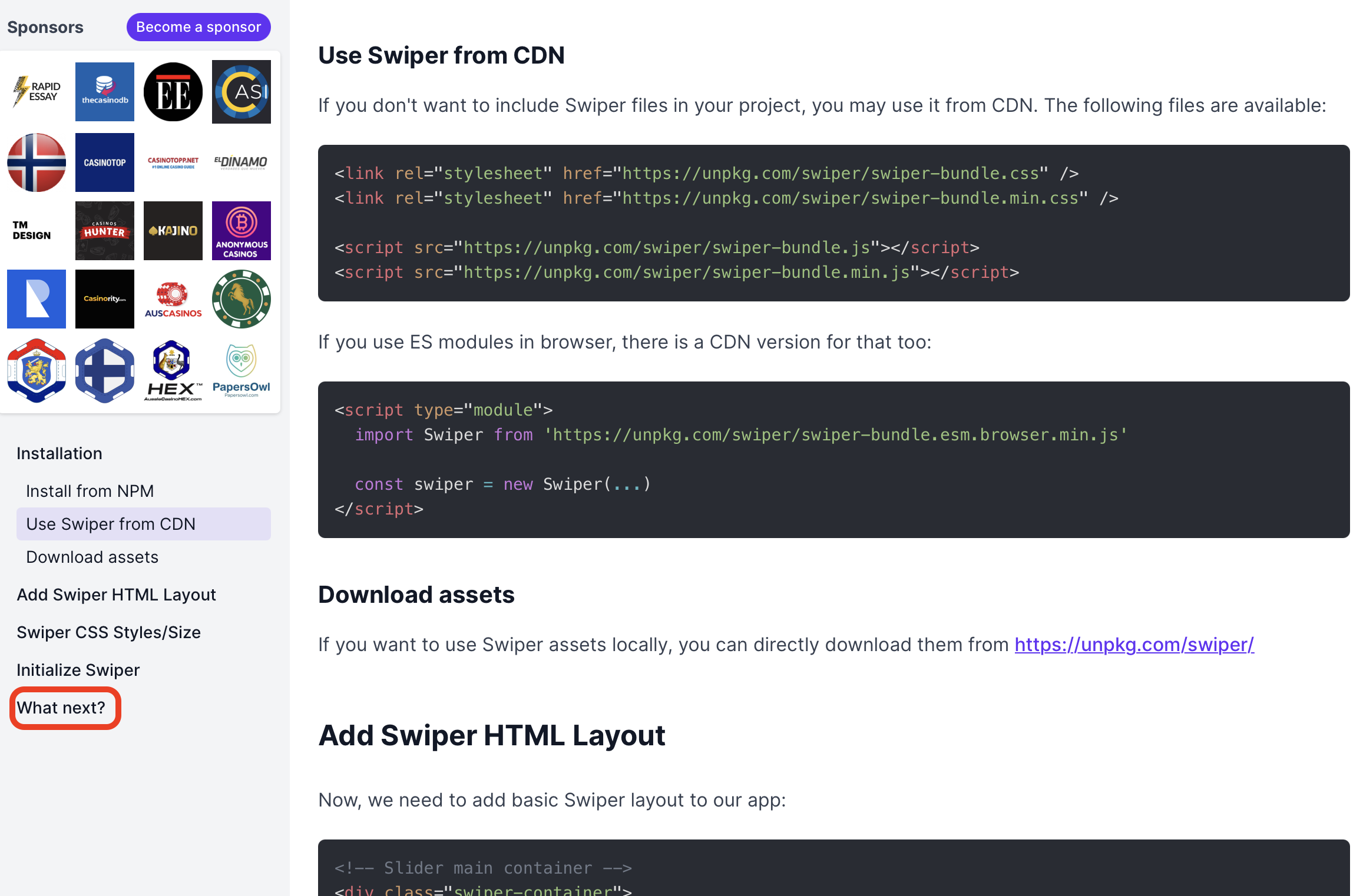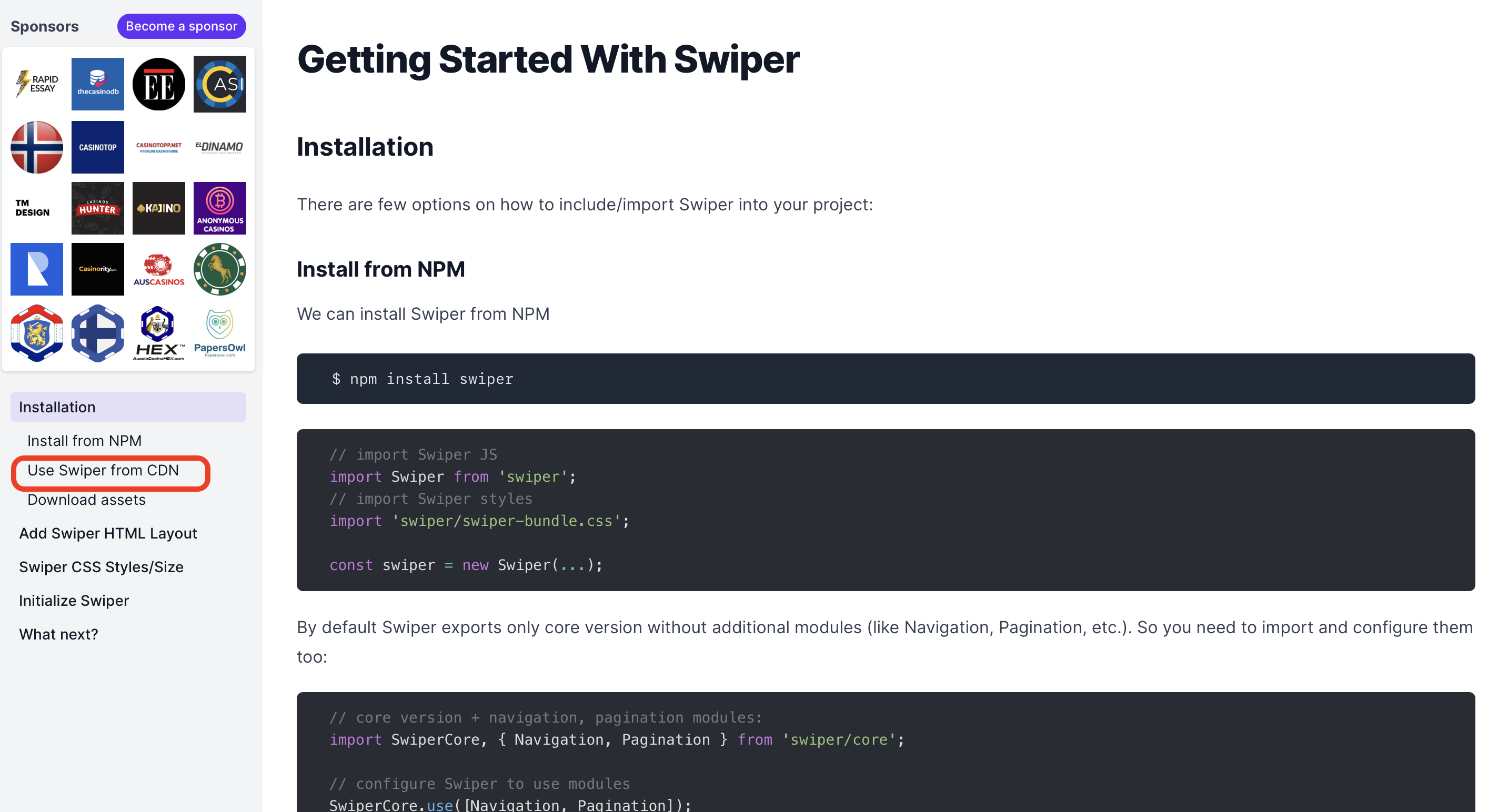 1. 왼쪽 installation메뉴에서 Use Swiper from CDN 클릭