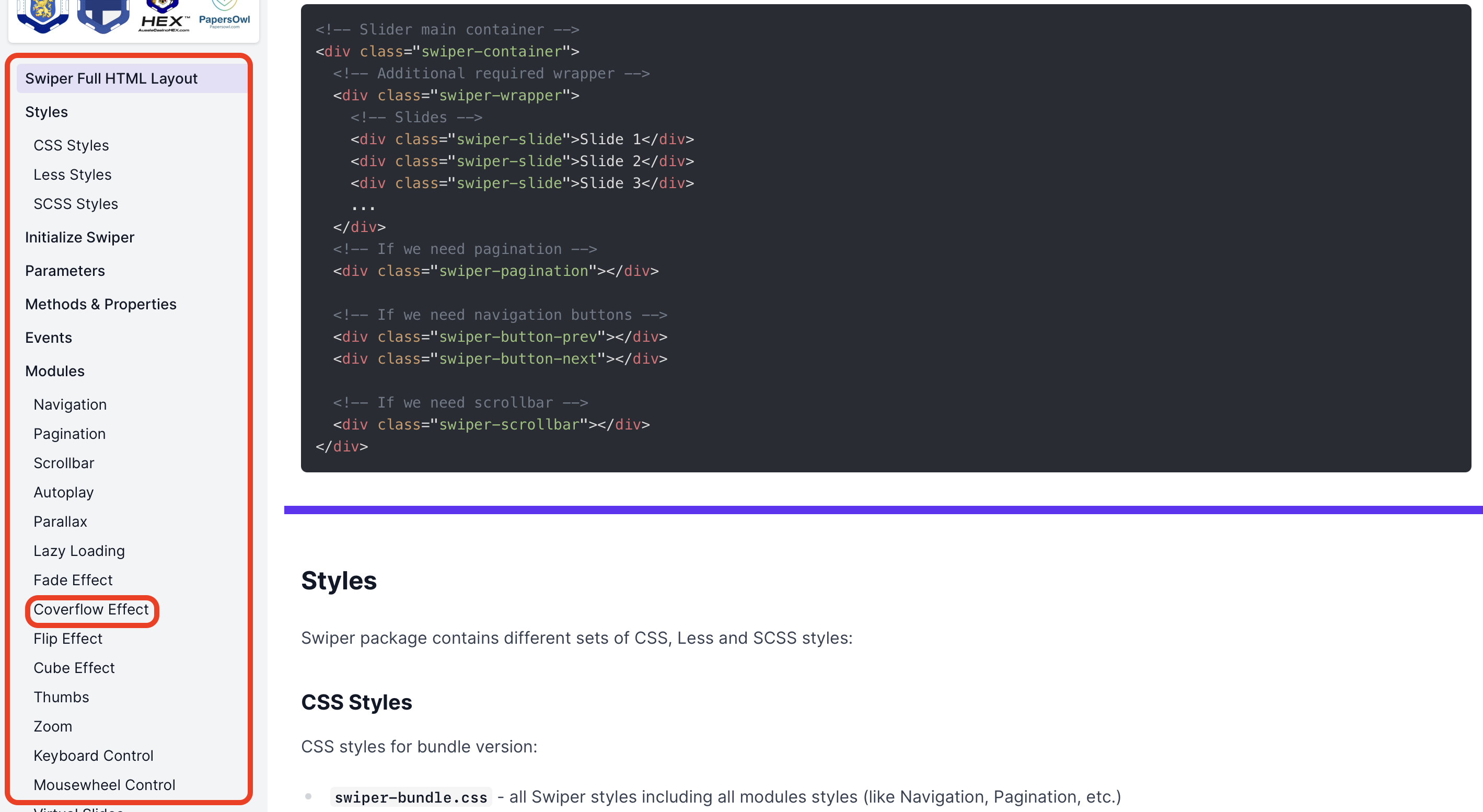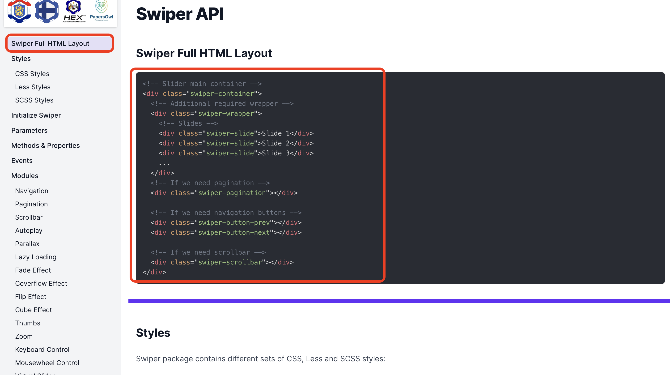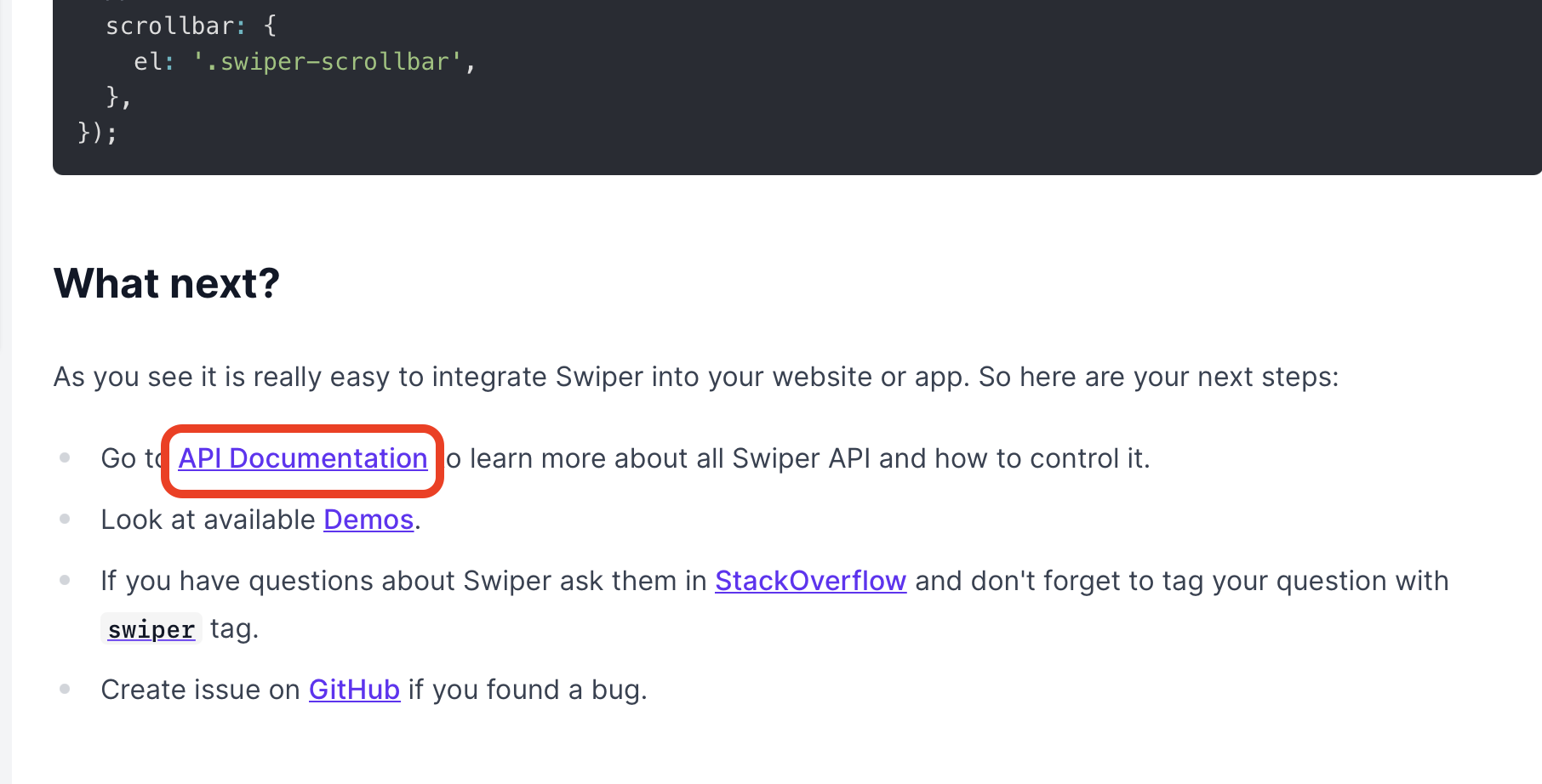 1. 왼쪽 installation메뉴에서 Use Swiper from CDN 클릭
