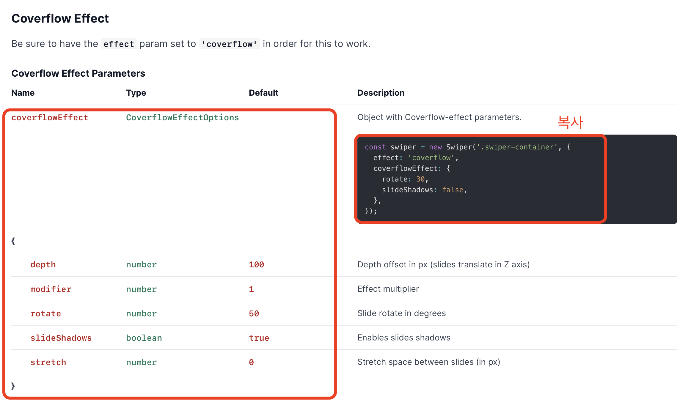 coverflowEffect: 사용하려는 효과에서의 상세설정