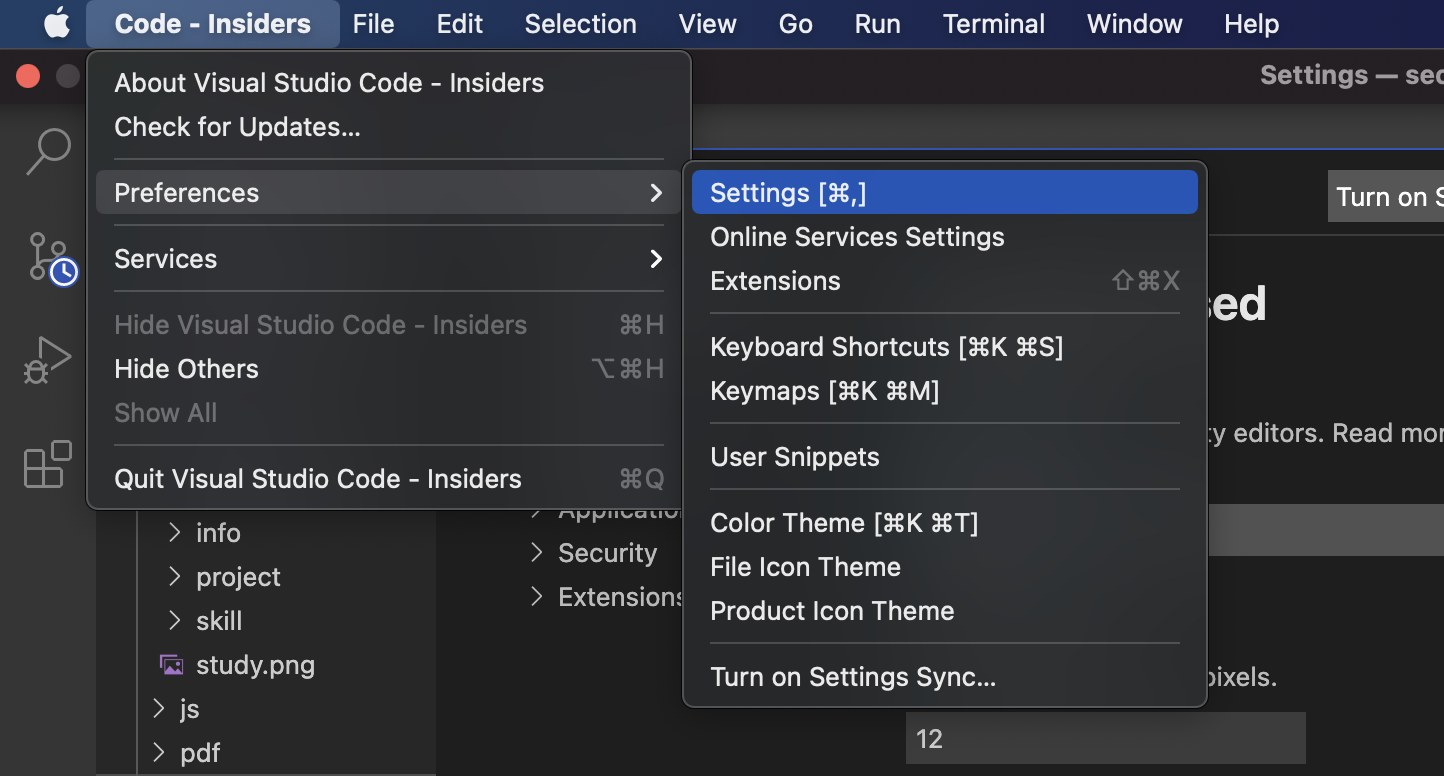 혹은, 아래 사진과 같이 Code > Preferences > Settings