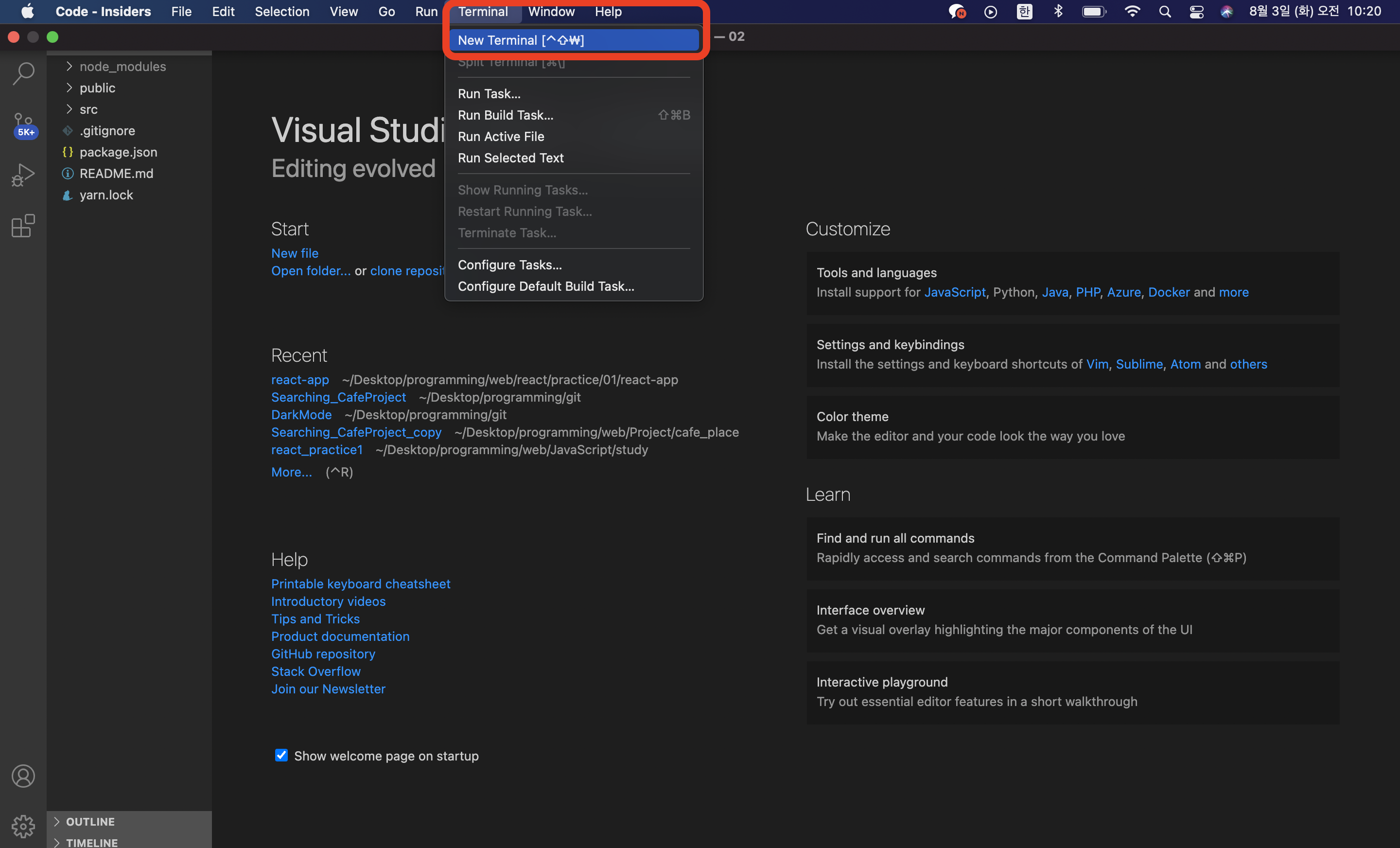 vscode내에서 터미널을 엽니다.