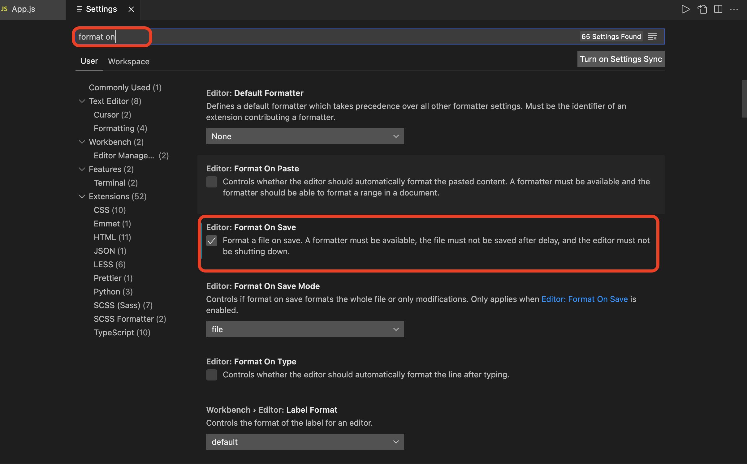 검색창에 format on save 입력 > Format On Save의 체크박스 체크