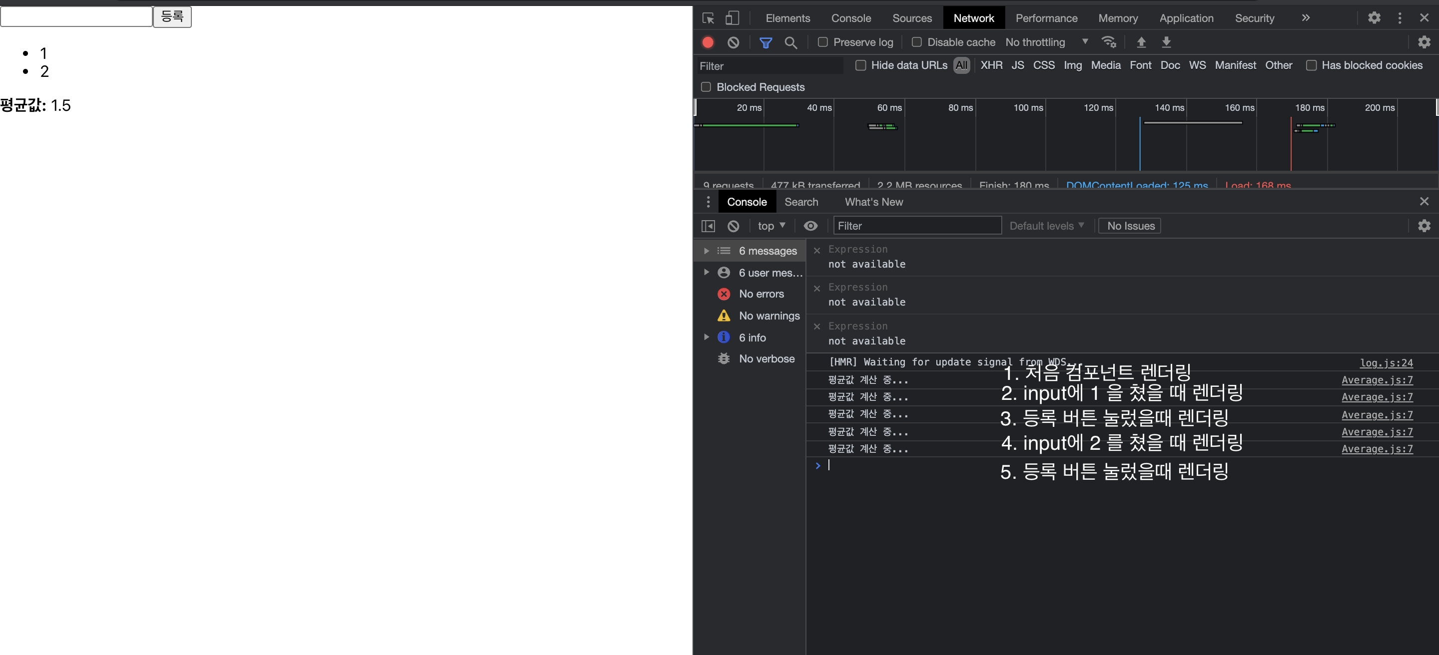 > 버튼 클릭시에도 getAverage함수가 동작하기 때문에 콘솔창에 "평균값 계산중..."이 뜸