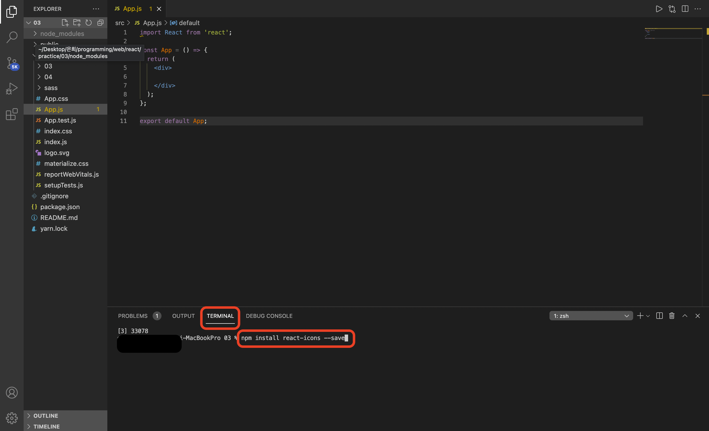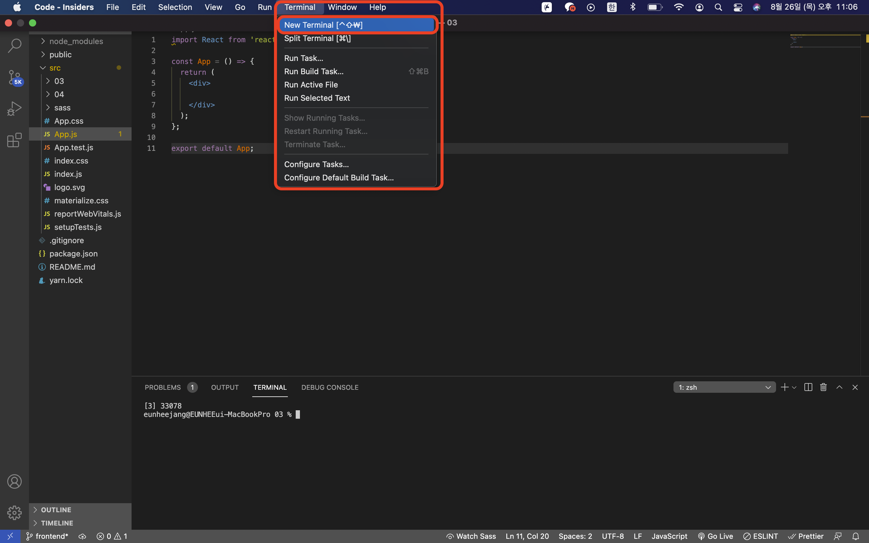 프로젝트를 진행할 파일을 코드편집기로 열어준 뒤, 터미널창을 열읍니다.