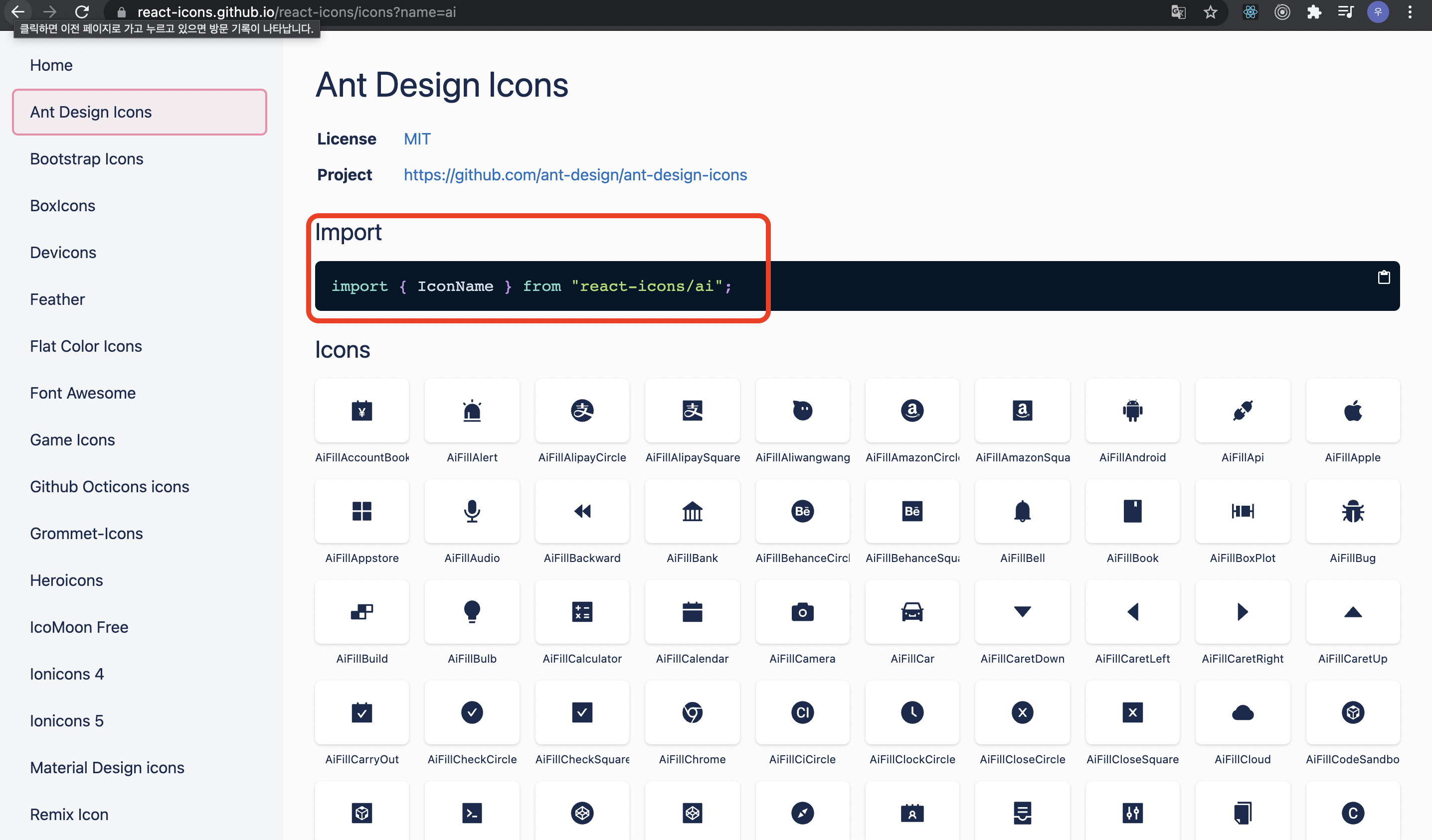 리액트에서 수많은 아이콘들을 제공해 주고 있습니다.