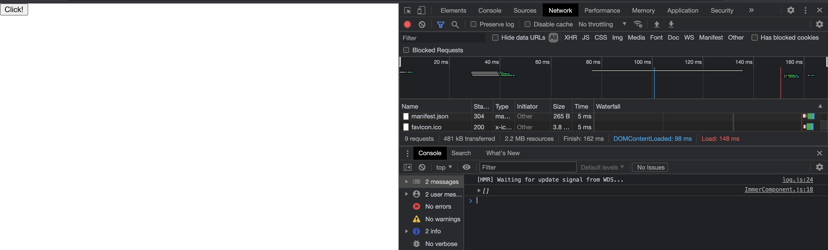 버튼 클릭 전 콘솔창에는 빈배열 표시