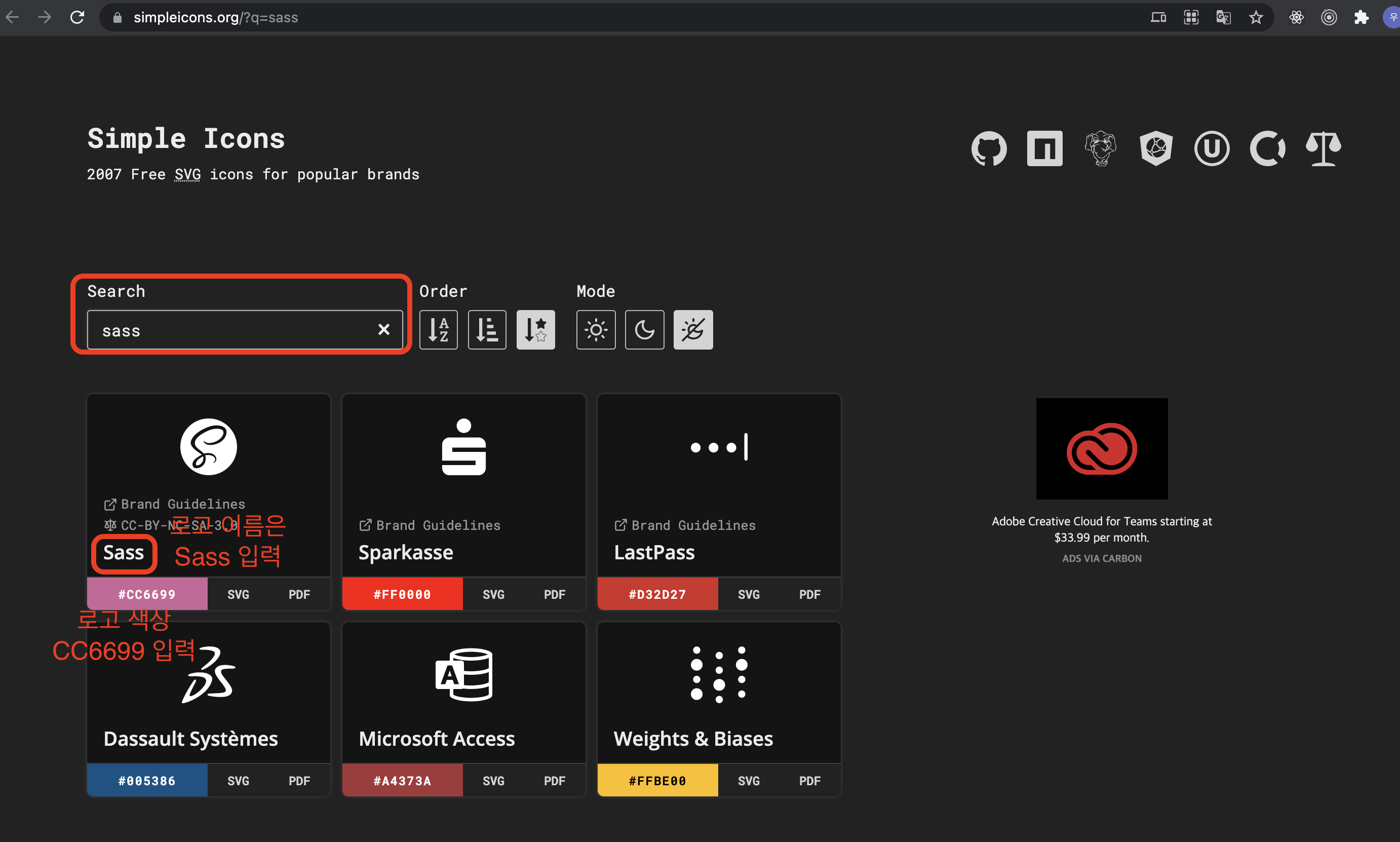 {로고 이름} : simpleicons.org <- 사이트 참고하셔서, 사이트에서 로고이름 검색해서 나오면 사용 가능!