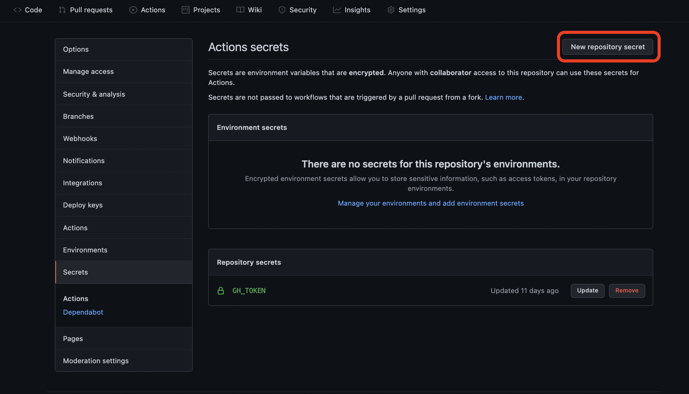 Name: GH_TOKEN, Value: 생성한토큰번호