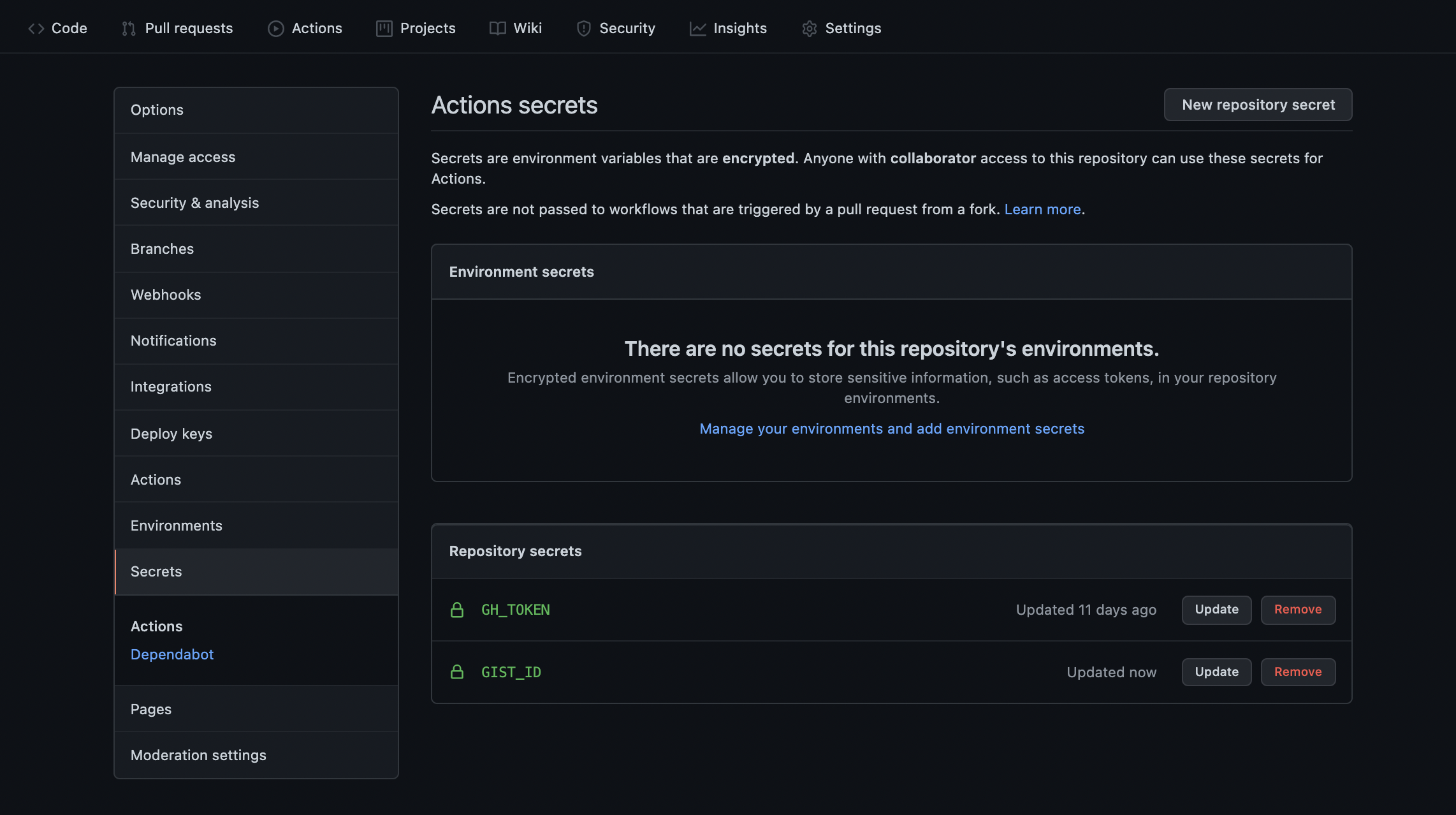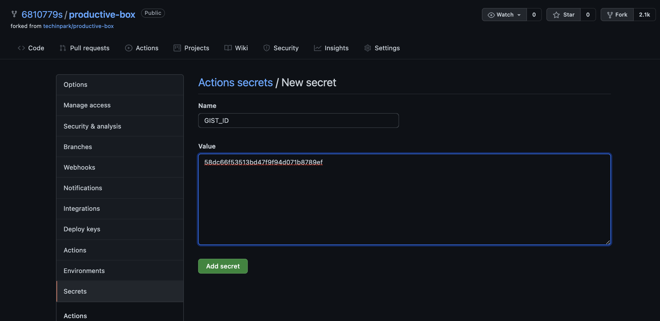 5) fork한 레파지토리에 gistID, 토큰번호 등록