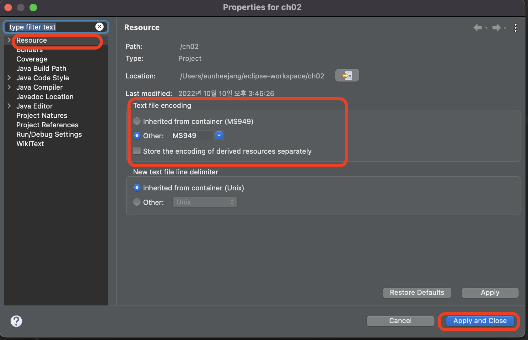 2-3. Resource > Text file encoding 에서 Other : MS949 > Apply and Close
