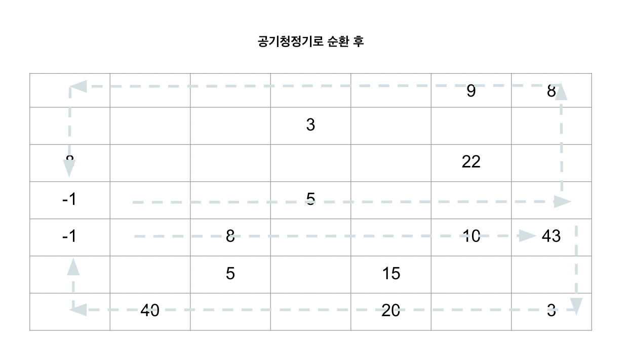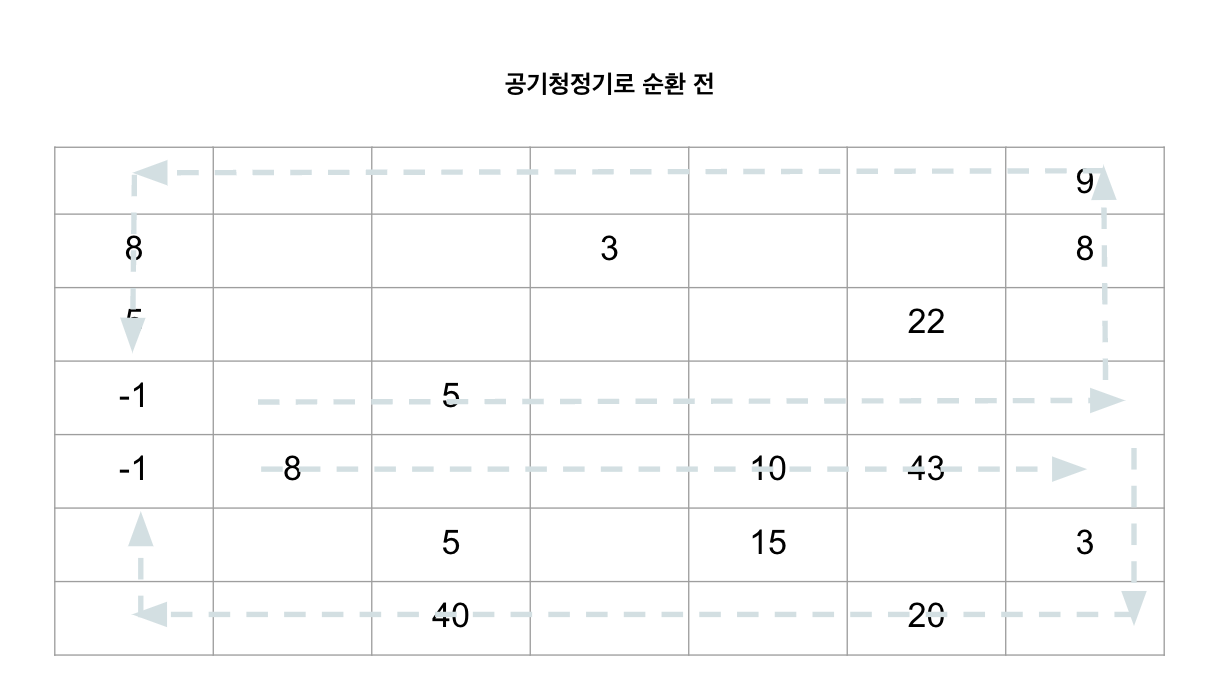 미세먼지를 제거하기 위해 구사과는 공기청정기를 설치하려고 한다. 공기청정기의 성능을 테스트하기 위해 구사과는 집을 크기가 R×C인 격자판으로 나타냈고, 1×1 크기의 칸으로 나눴다. 구사
