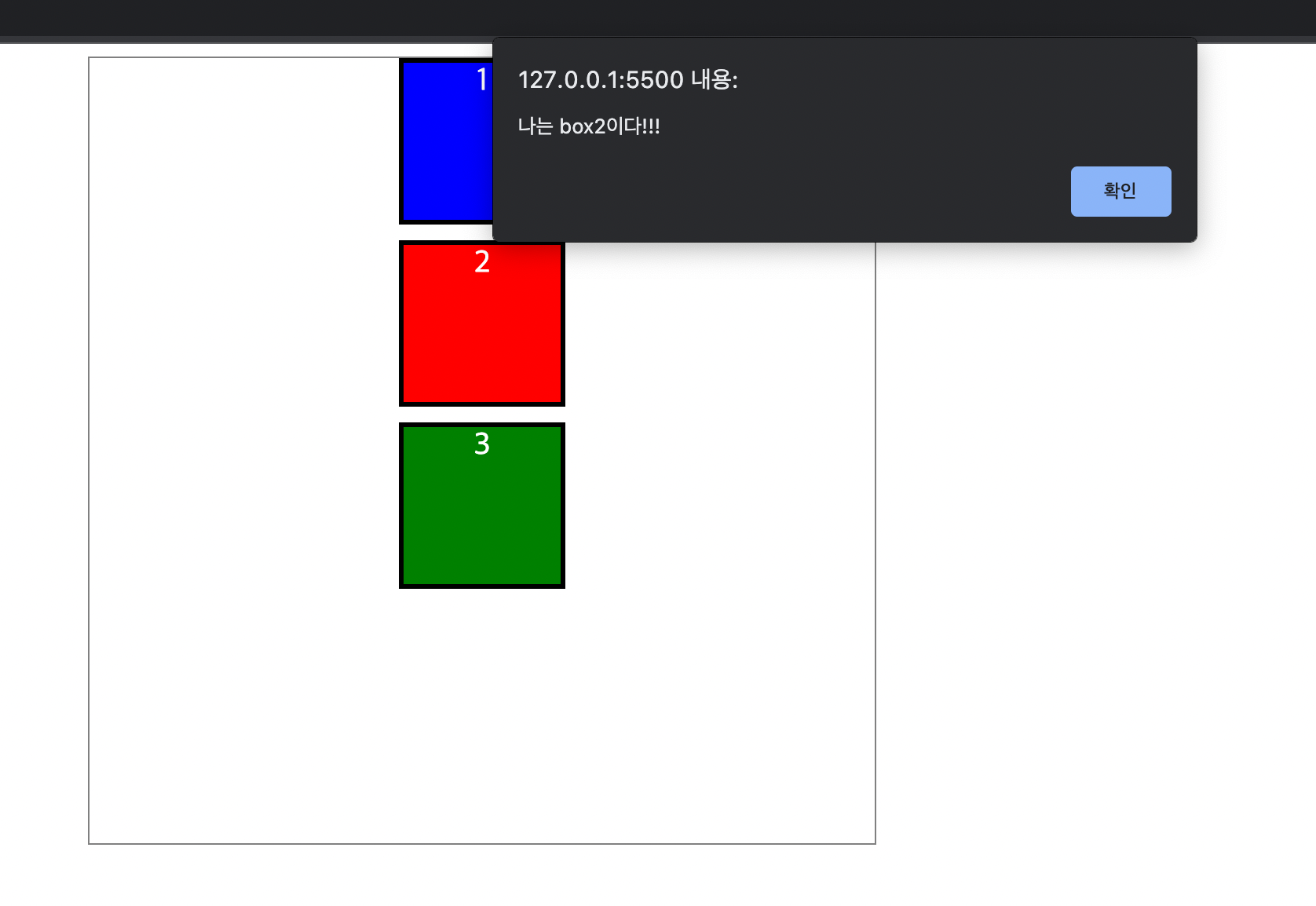 위와 같은 코드를 작성하면 박스를 클릭했을시 알림창이 뜬다. (아래 사진 참고하세요)