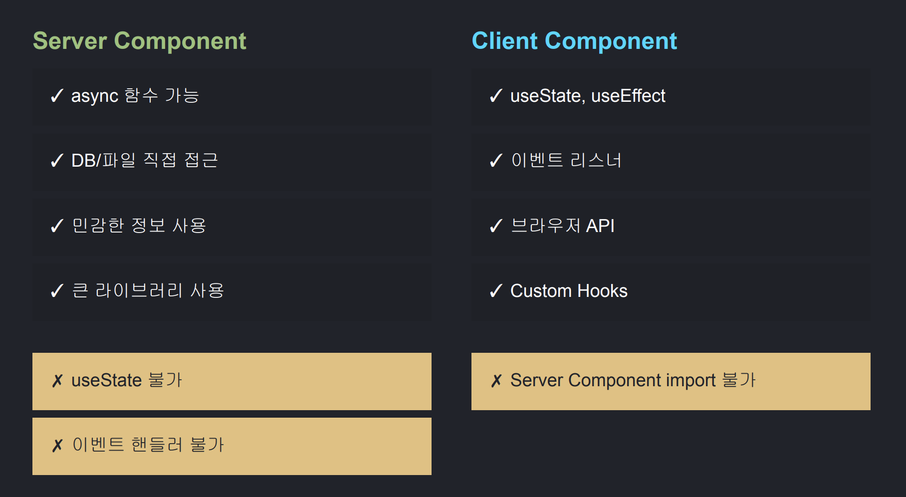 | 컴포넌트 구분 | 없음 | 있음 (Server/Client) |