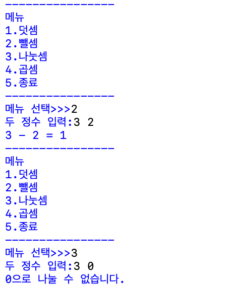 print("메뉴\n1.덧셈\n2.뺄셈\n3.나눗셈\n4.곱셈\n5.종료") #메뉴 출력