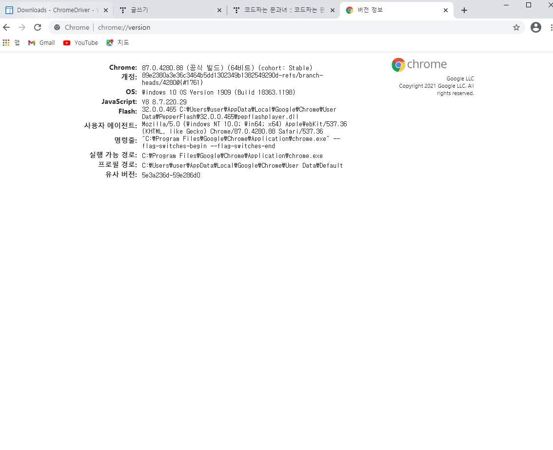 버전 확인 법:Chrome: 87.0 .... <- 제 크롬은 87버전 입니다.
