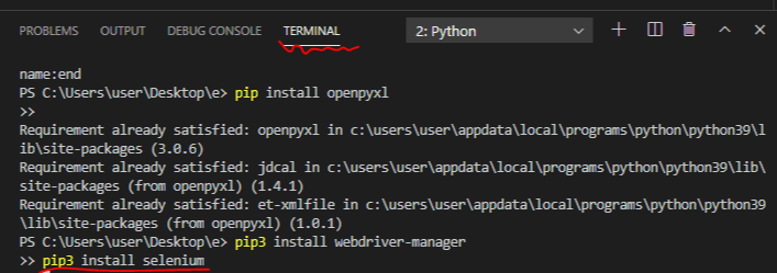 pip3 install selenium 를 터미널에 쳐서 설치.