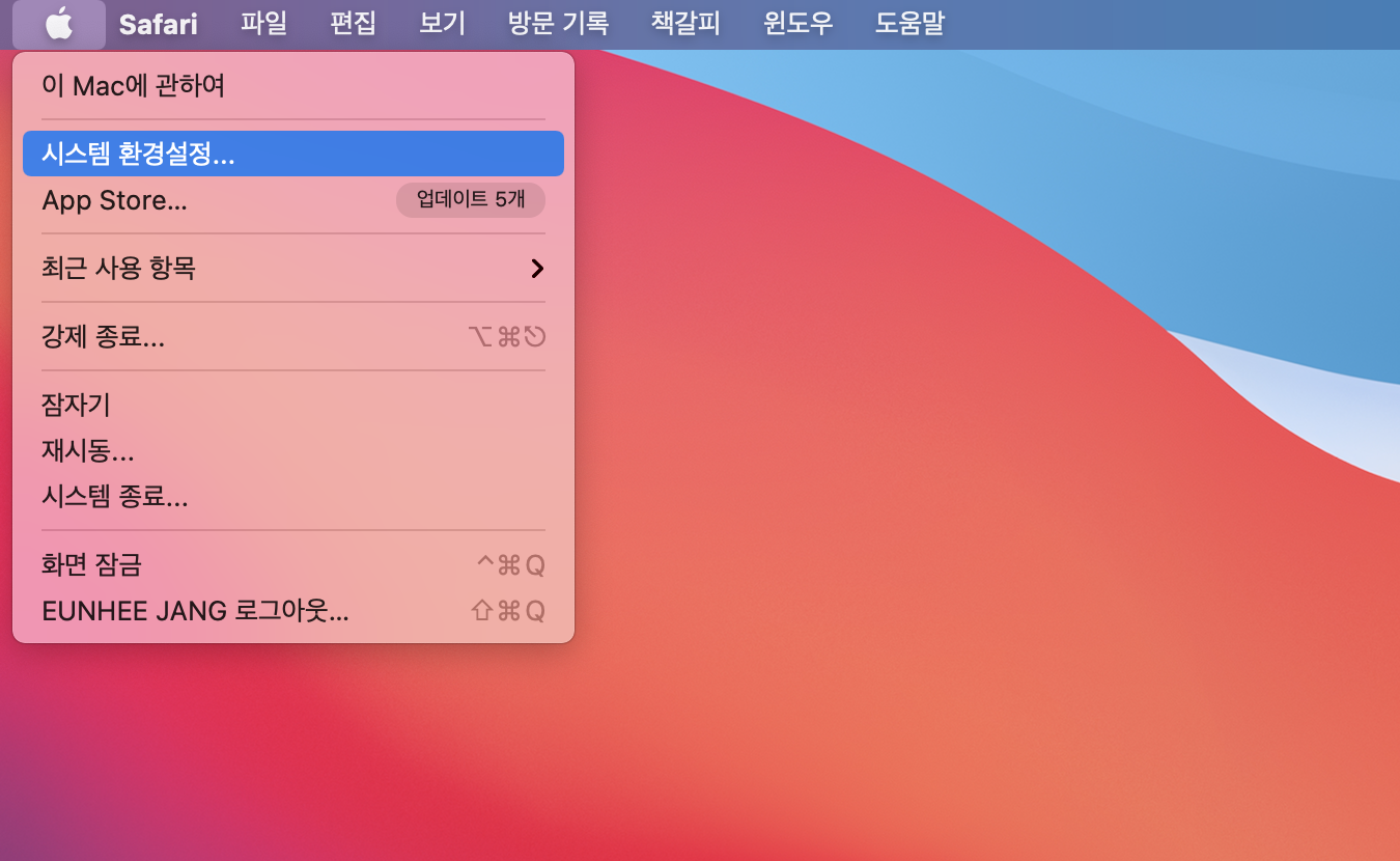 1. 왼쪽 상단 사과버튼 클릭 후, 시스템 환경설정 클릭.
