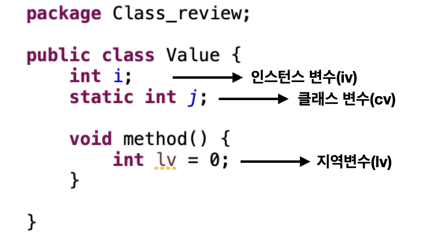 - 클래스 변수(class variable), 인스턴스 변수(instance variable), 지역변수(local variable)