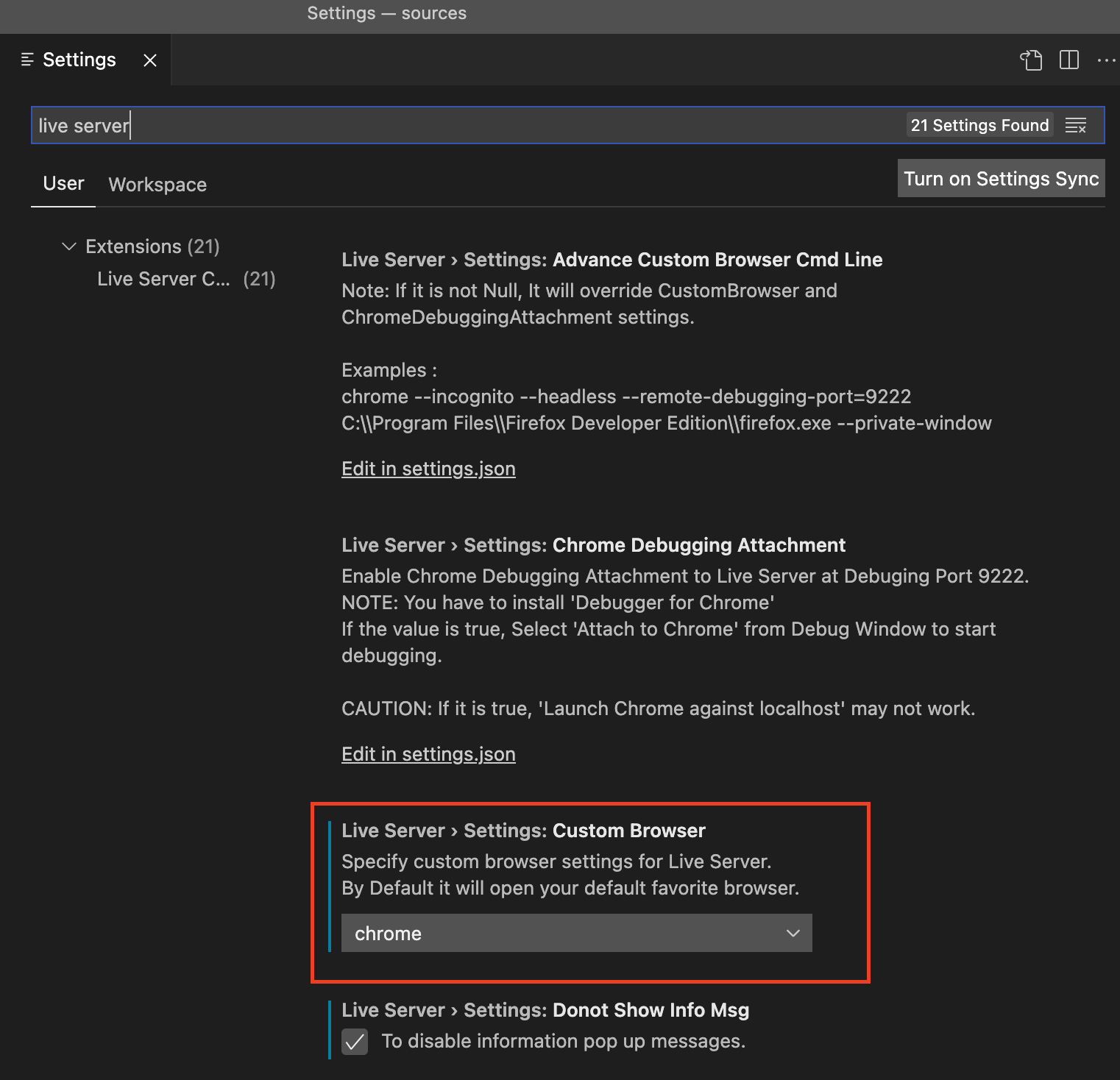 3. 설정 검색창에 live server 검색 후 브라우저 설정