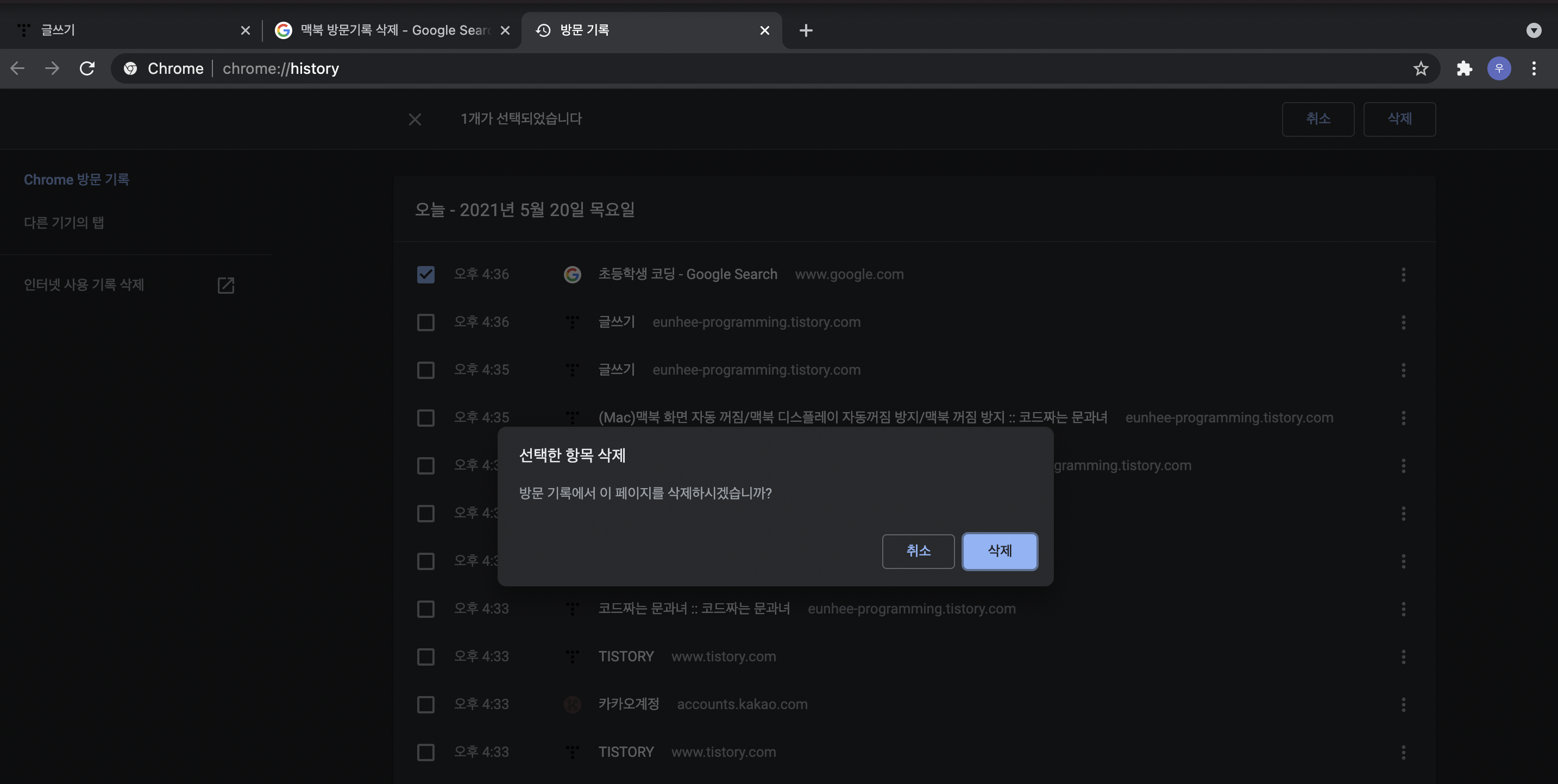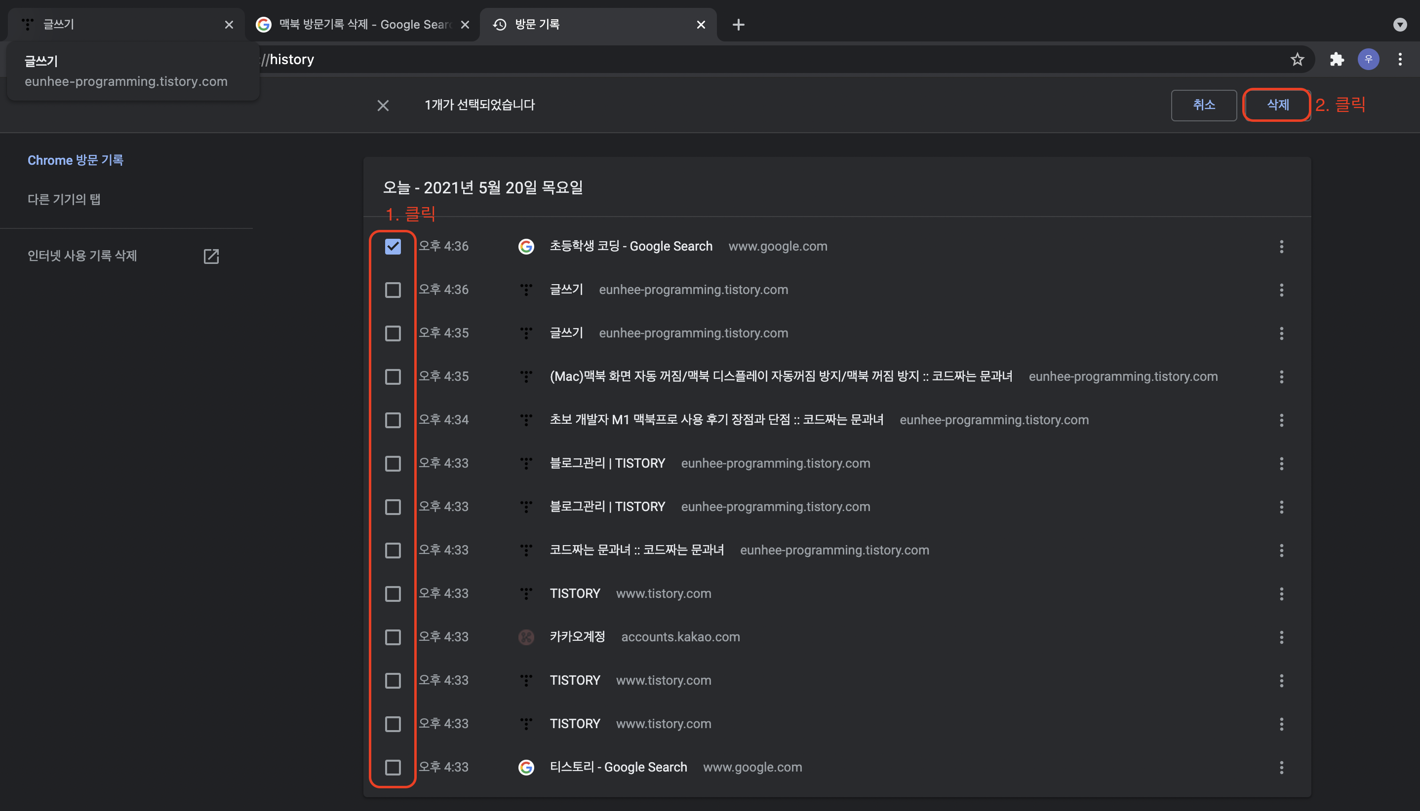 첫 번째는 자신이 원하는 기록만 선택하여 삭제하는 방법.