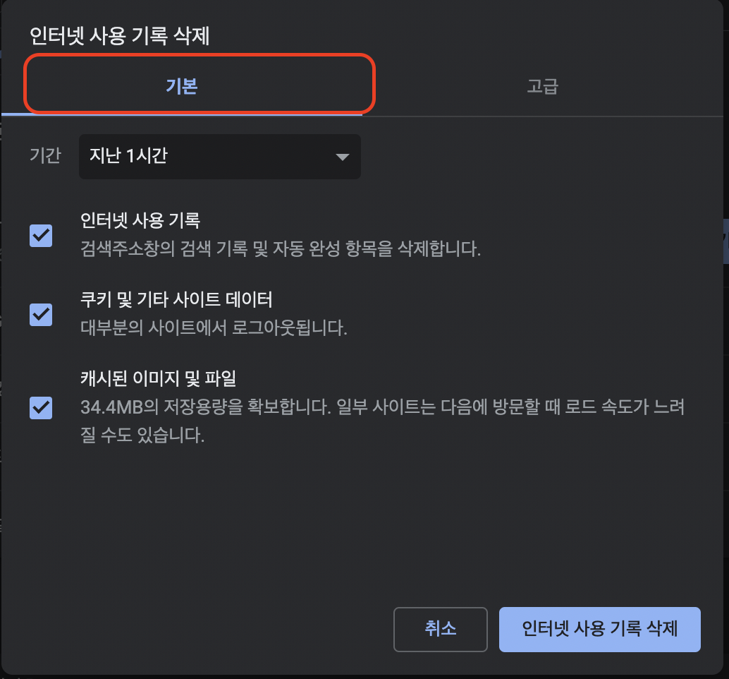 3. 기본 탭에서 삭제하고 싶은 기록이나 쿠키 선택 후