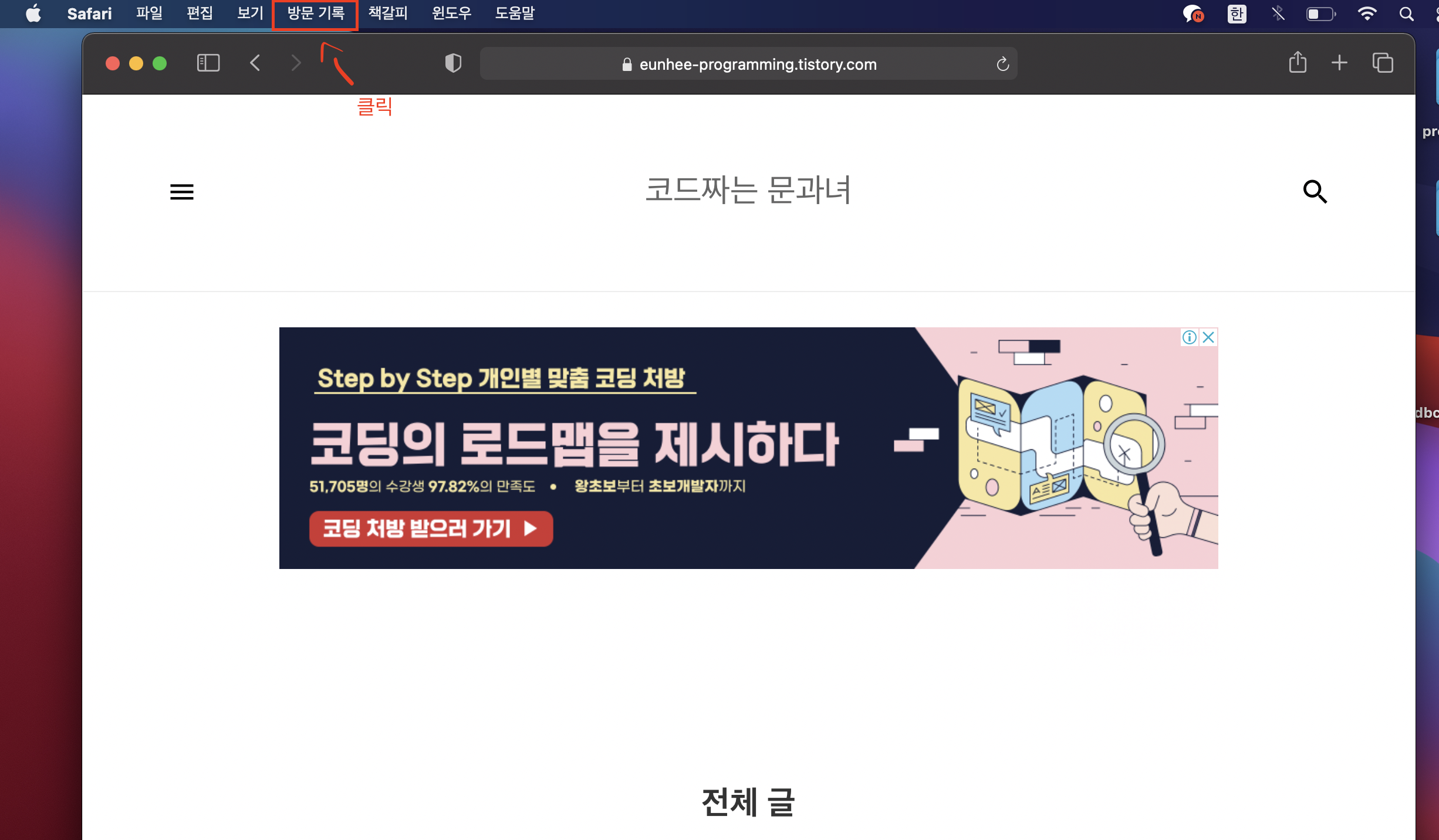 2. 인터넷 창을 열은 후, 맥북 화면 상단에 방문 기록을 클릭합니다.