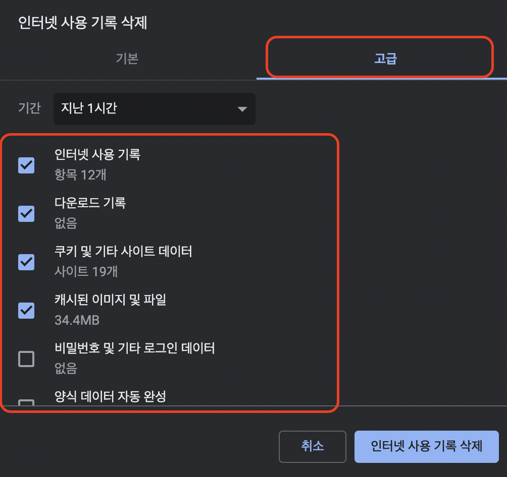 고급 탭에서 원하는 기록 혹은 쿠키, 데이터만 골라서 삭제 가능!