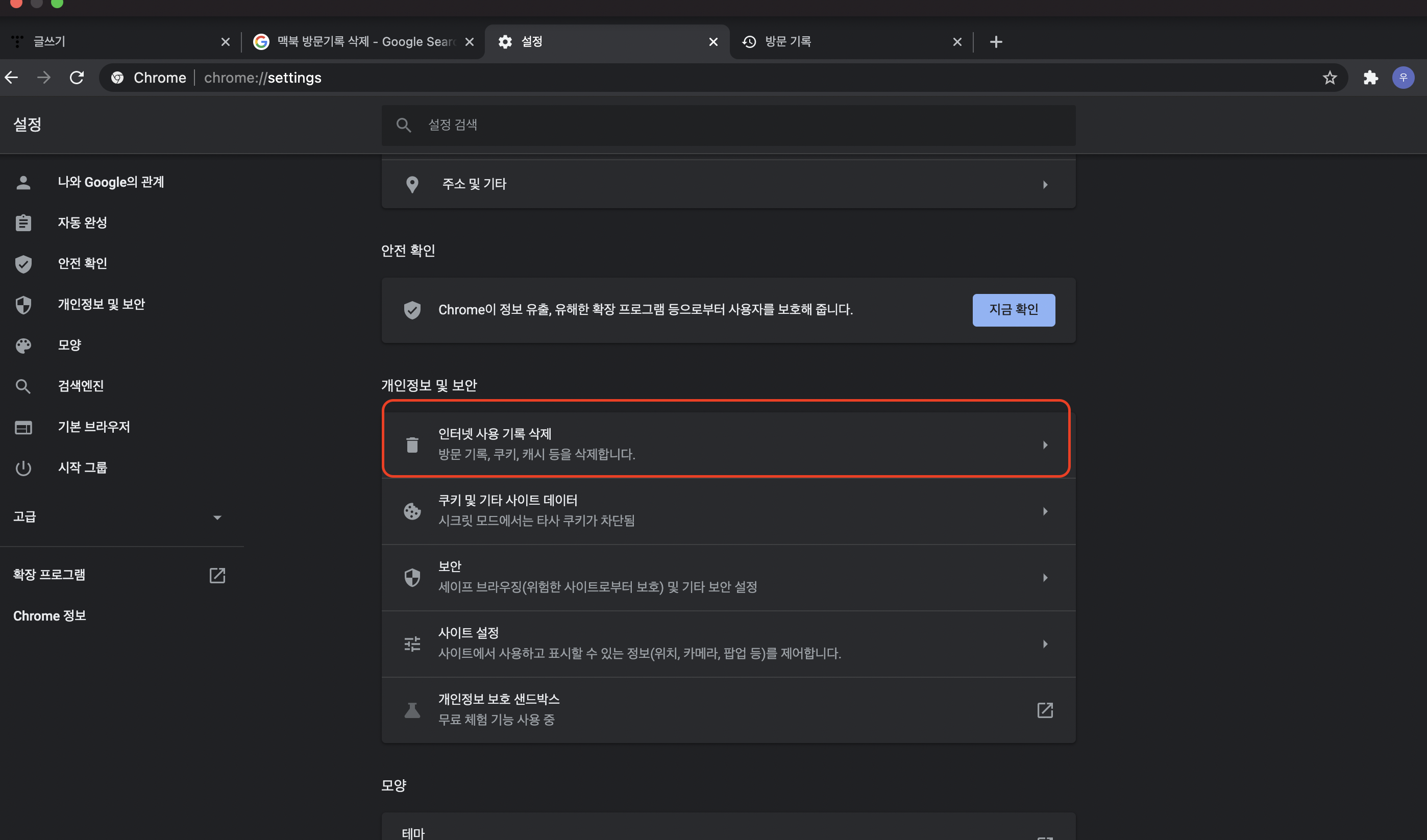 두 번째는 전체 기록 및 쿠키 삭제하는 방법.