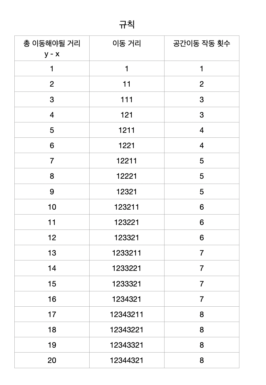김우현을 위해 x지점부터 정확히 y지점으로 이동하는데 필요한 공간 이동 장치 작동 횟수의 최솟값을 구하는 프로그램을 작성하라.