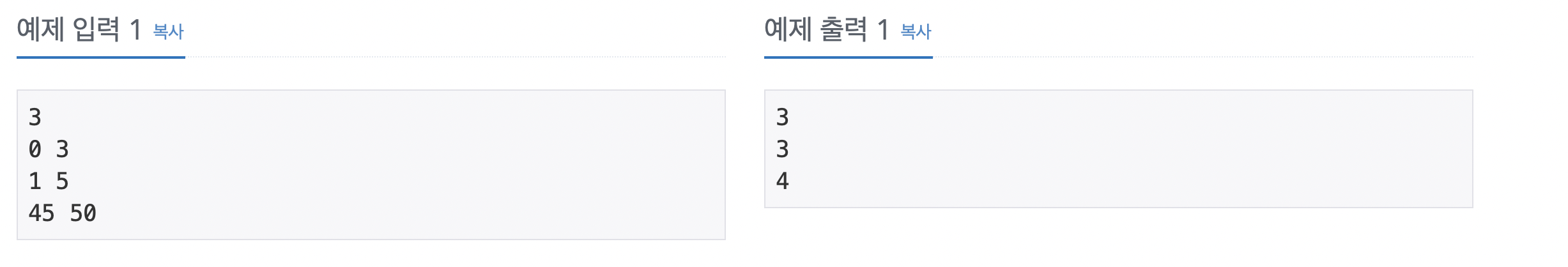 입력의 첫 줄에는 테스트케이스의 개수 T가 주어진다. 각각의 테스트 케이스에 대해 현재 위치 x 와 목표 위치 y 가 정수로 주어지며, x는 항상 y보다 작은 값을 갖는다. (0 ≤ x < y < 231)