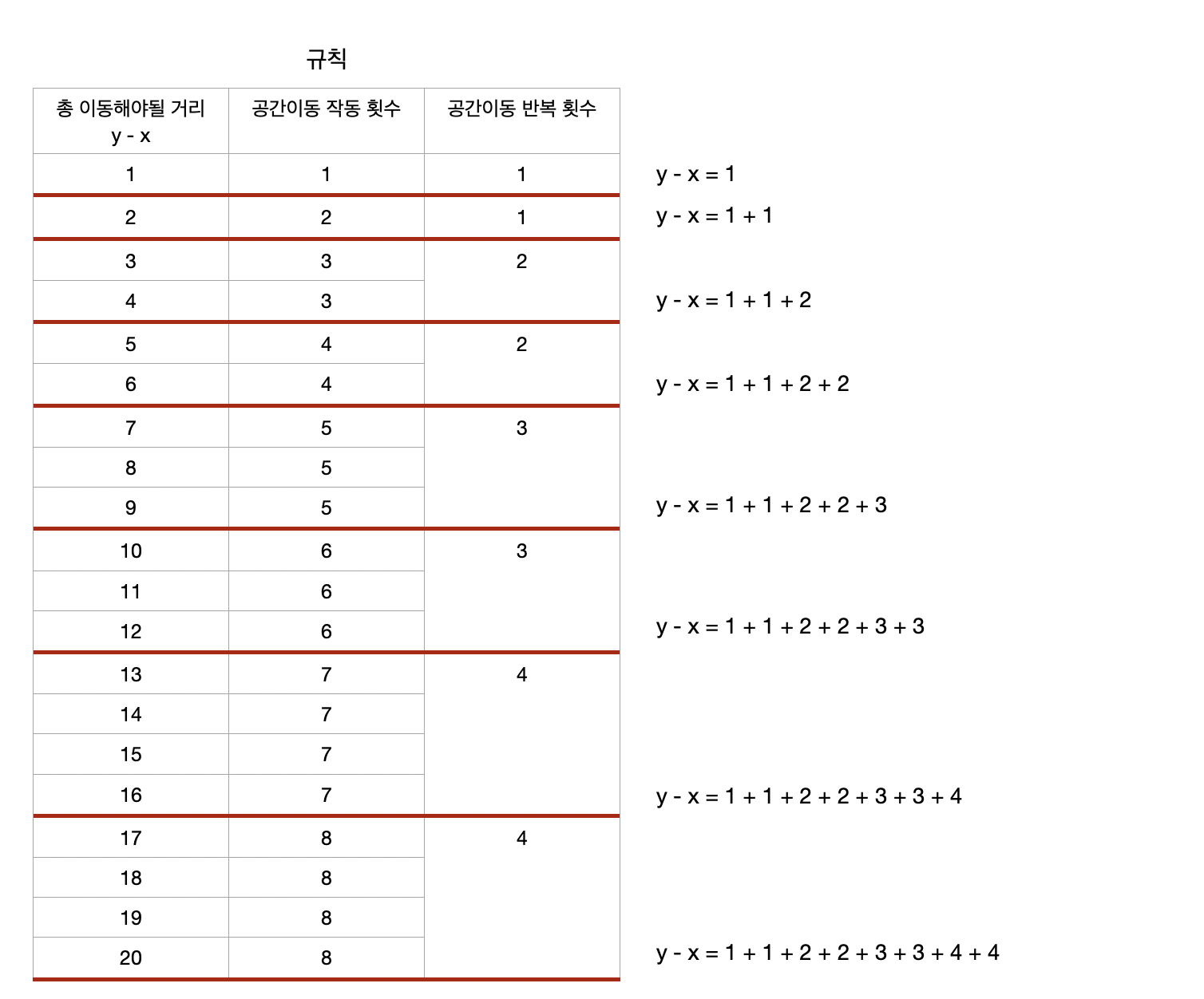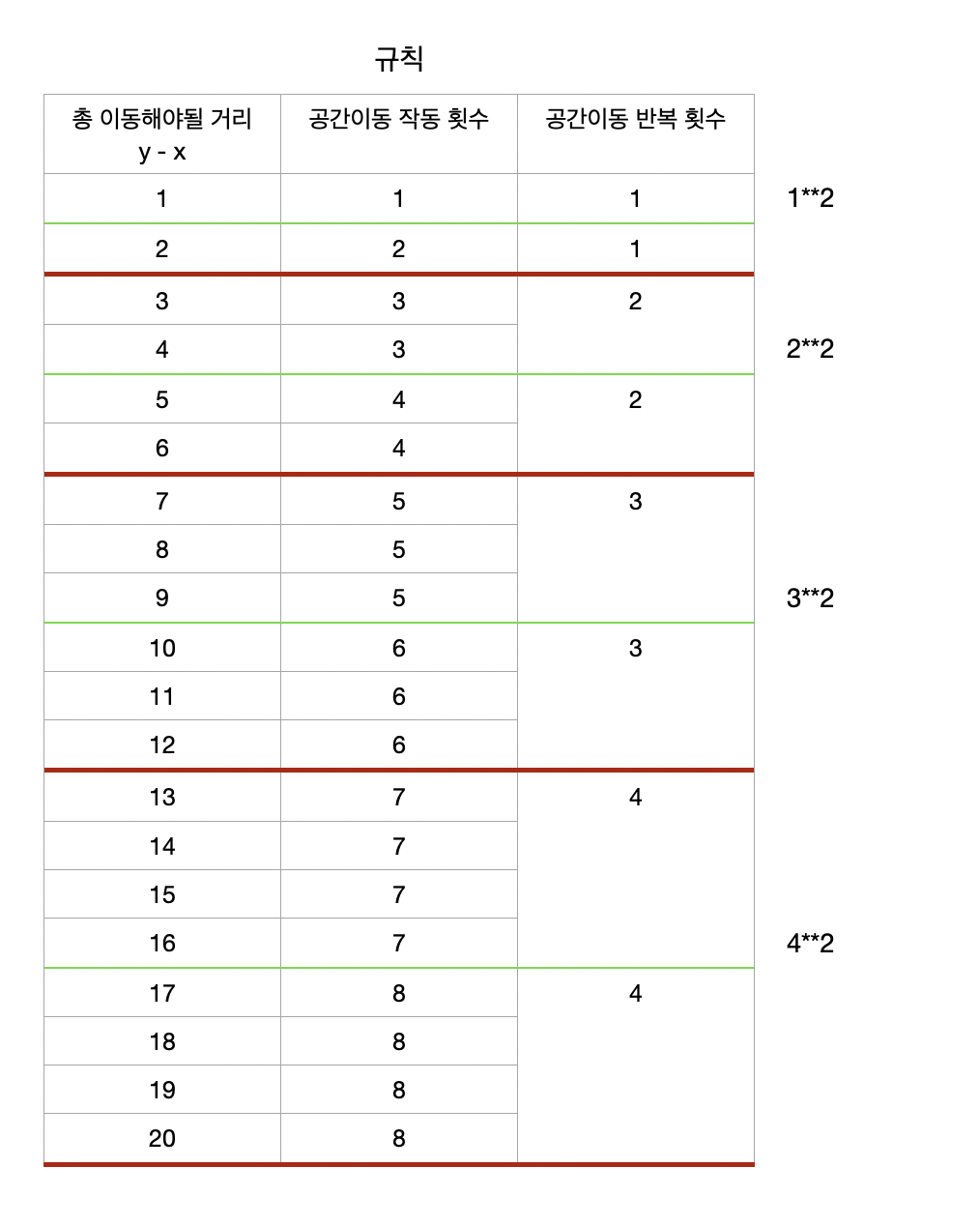 이 규칙으로, 만약 총 이동 거리가 15일때, 공간이동 작동 횟수를 구하려면 반복 횟수의 합으로 구하면 됩니다.
